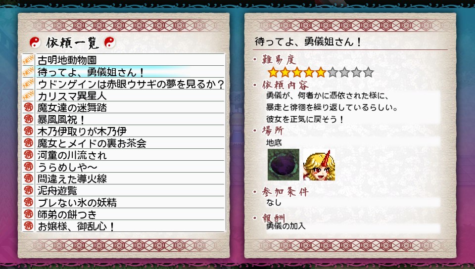 阿求を仲間にする方法についてはネタバレ回避してたのでまだ仲間にしてませんが、本編ラスボスクリア前に仲間にできることと、追加ダンジョンが出現していたことから予想はできそうなものでしたがね(;'∀')