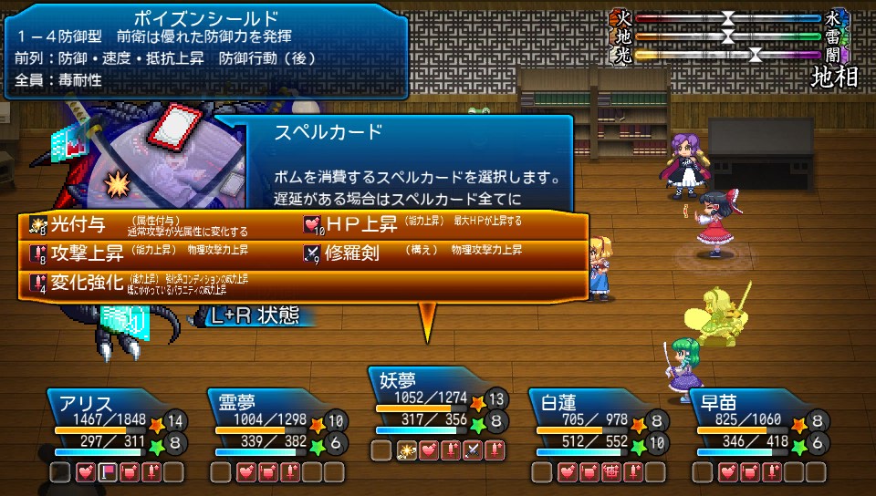 この時霊夢のスキルなどで先手を打って地相を光に傾けると、カオスランドで光地相を吸収して回復してしまうので、ランドは光ではなく中立に保つよう調整することが重要です