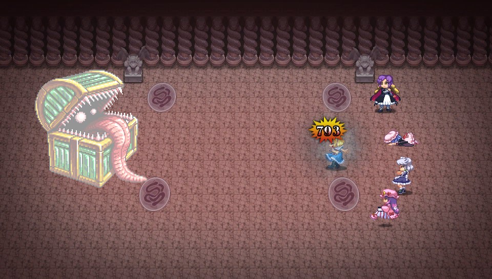 例によって宝箱には複数のミミックが配置されているので、ザコ戦で生き残る意味でも、耐性で固めたアリスを囮にできる陣形で事故を防ぎましょう