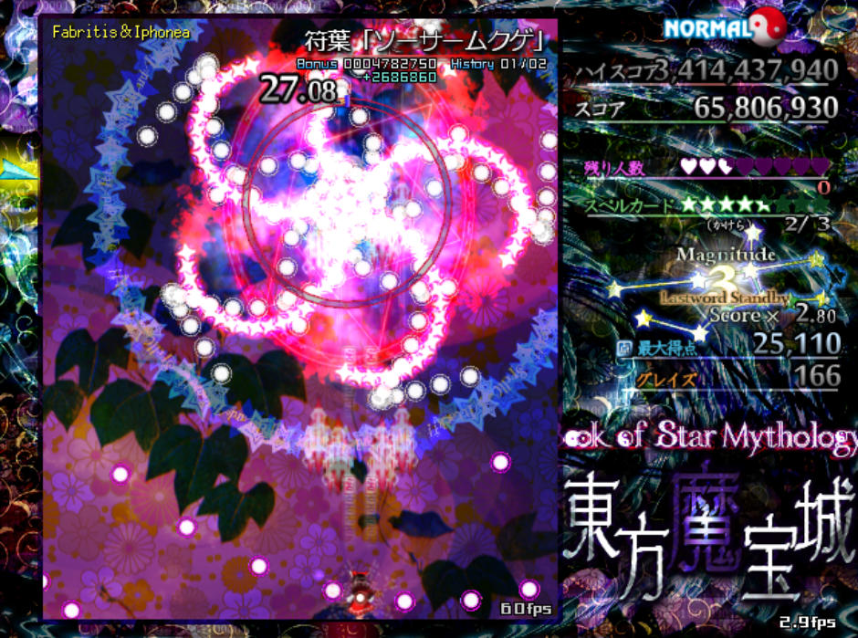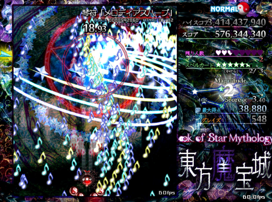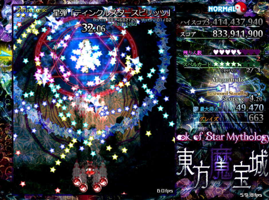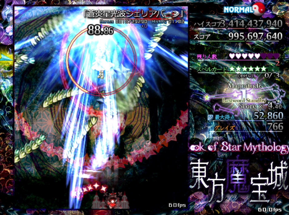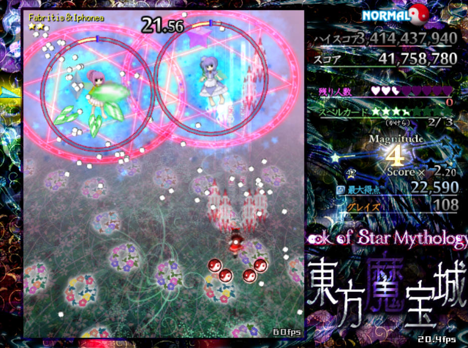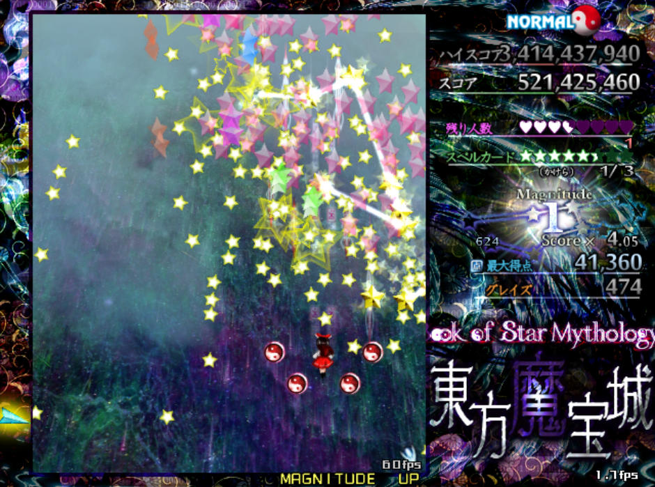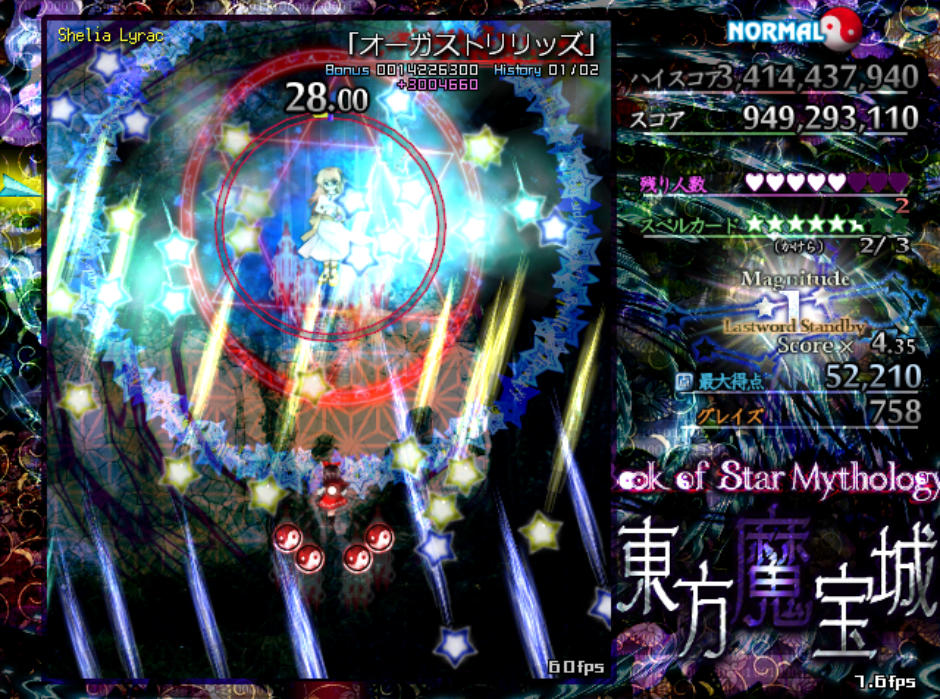 反面、弾幕の難易度自体は原作の平均よりもやや難しめになっており、特にボスが最後に使用するラストワードは標準的な難易度(Normal)と比較すると規格外の高難度(Lunatic級)となってます