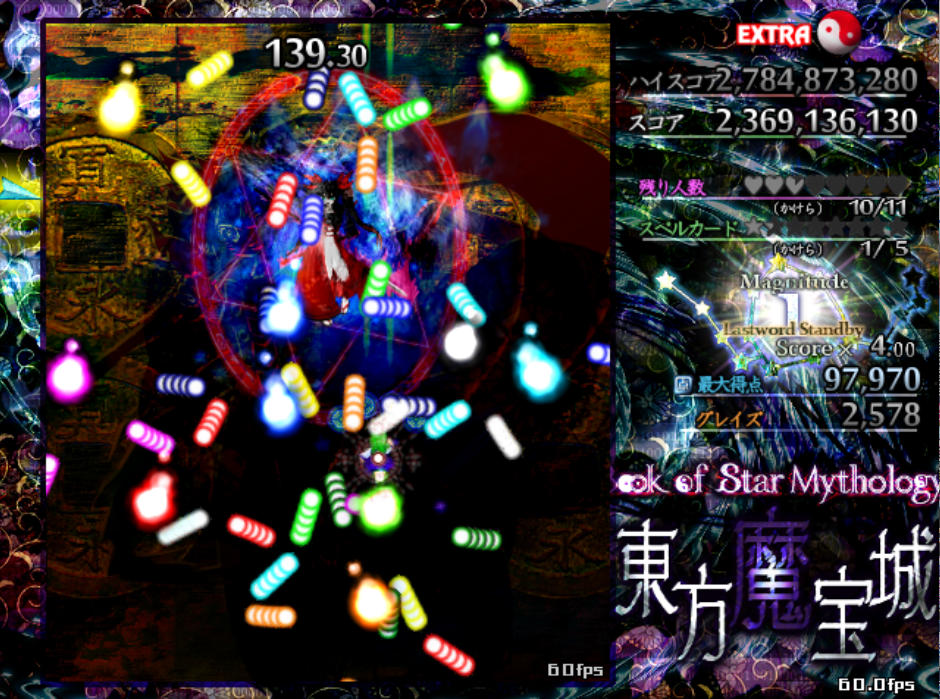 ラストスペルはHPゲージが4本ある長期戦だ! 第2段階は鱗弾の速度が非常に速いため見た目以上に難易度が高い 第3段階は高密度の銭弾だが、弾速が遅いので落ち着いて避けよう 第3段階は高密度の銭弾だが、弾速が遅いので落ち着いて避けよう