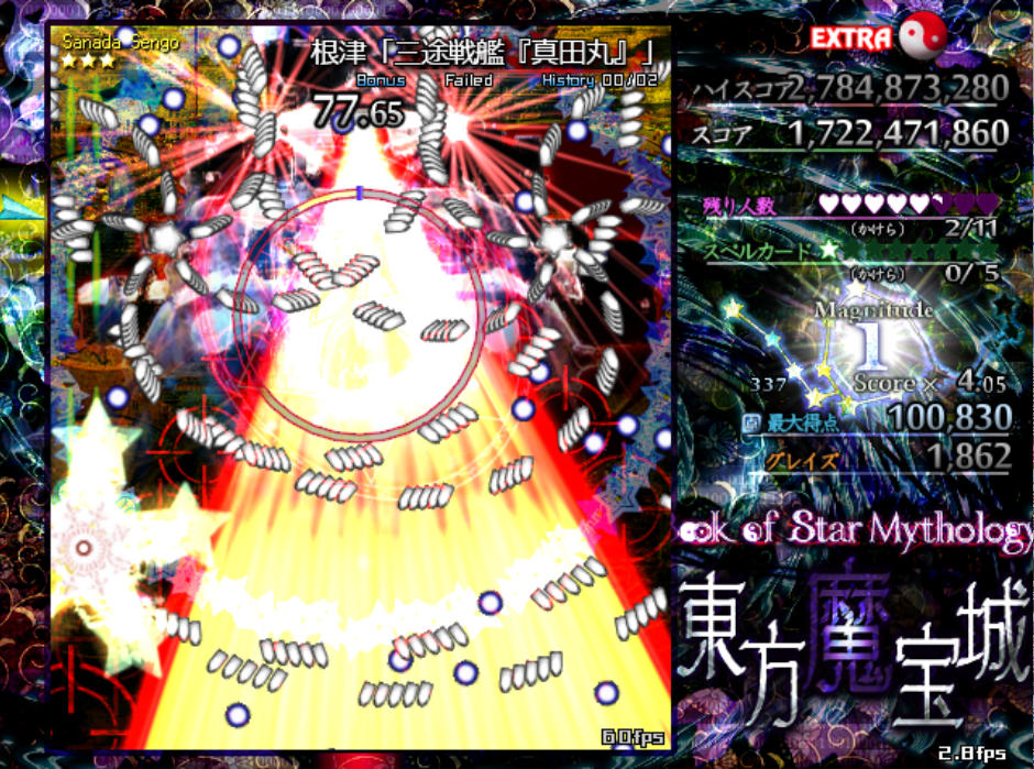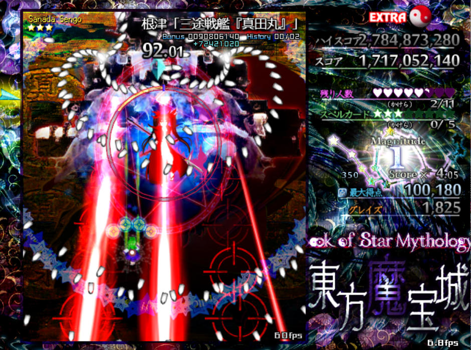通常弾幕6 圧倒的な物量のクナイ弾が襲い掛かる! 第6スペル 河の流れのようにウェーブする 流れに従って段列の隙間が大きい場所へ 第6スペル 河の流れのようにウェーブする 流れに従って段列の隙間が大きい場所へ 第7スペルではなんと戦艦が弾幕を放ってくる!予告線の代わりに専用の照準が表示されるぞ! 大口径の主砲はこんなに範囲が広い!迫力満点! 通常弾幕8でも引き続き戦艦が攻撃してくる! 第8スペルは煙幕で視界を奪うダイレクトアタック!弾幕自体は自機狙いシンカーと速度の遅い弾列のみなので簡単 耐久スペル第1段階 スペカ名、これSASUKEじゃねえか!?