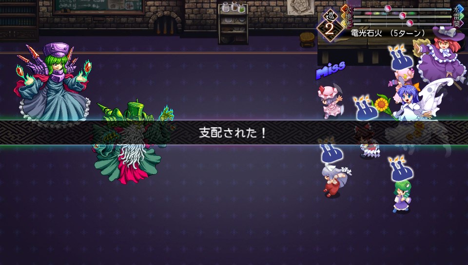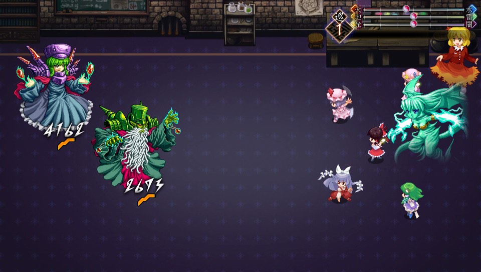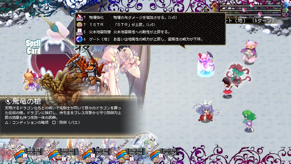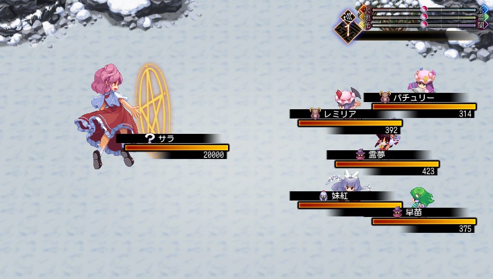 サラはフィールドを操作するスペルカードで四属性の威力を変化させ、そのまま強化された属性の全体魔法でコンボを繋いできます