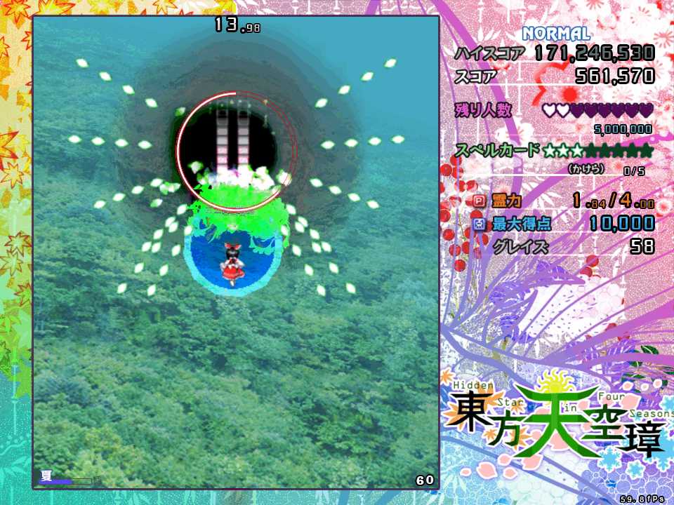 そしてシリーズ経験者にとってなじみのない仕様が、ボスのスペルカード中に季節開放を使用しても取得失敗にはならないということ