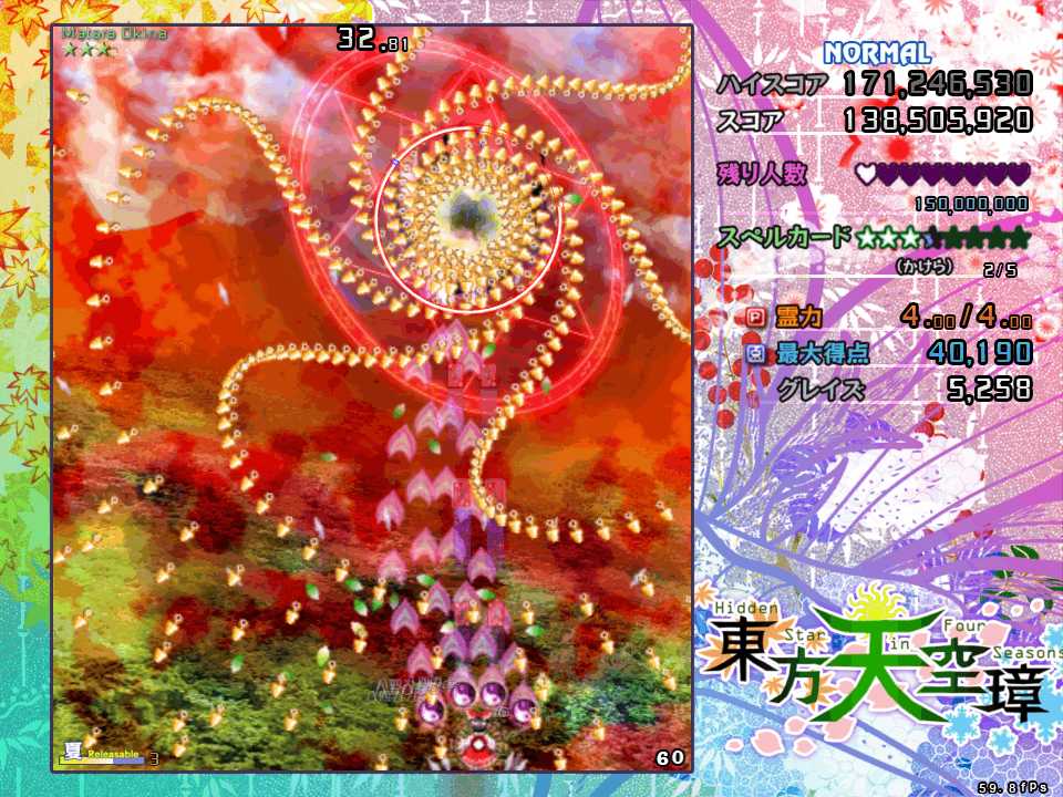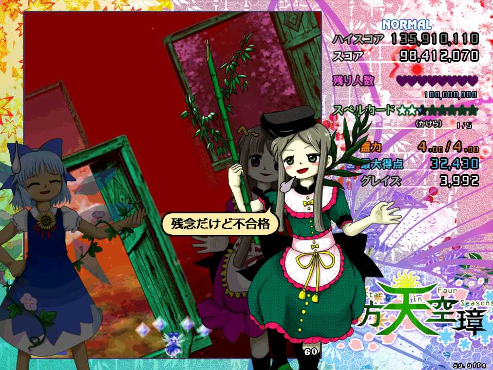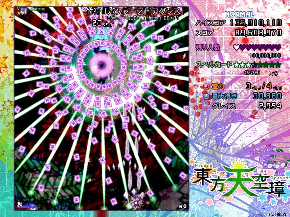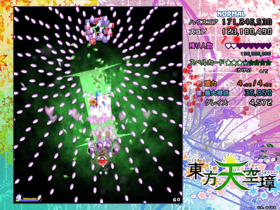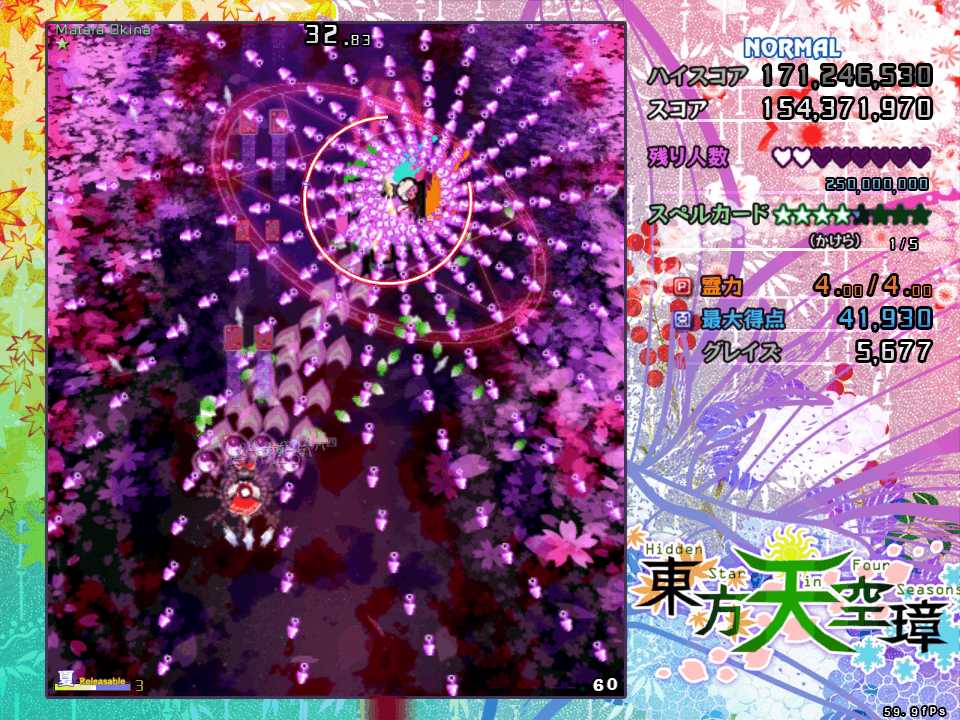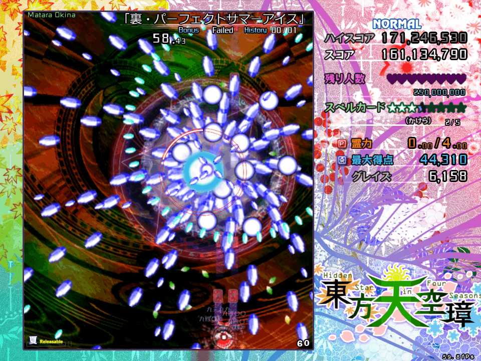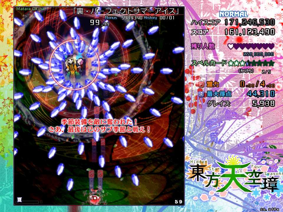 そして春夏秋冬、弾幕は全く違うのにどのスペルカードも非常に難易度が高く、季節開放は封印されてるし、ボム耐性もあるのでまさにゲームクリア前の最後の難関といったところです