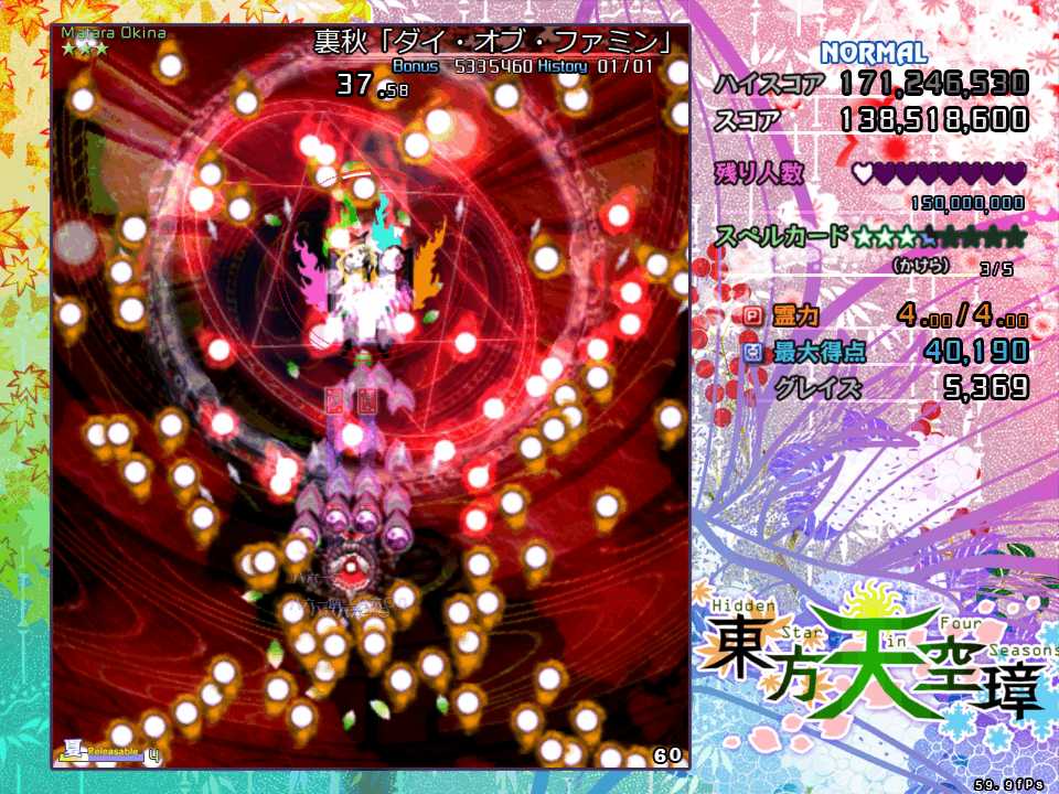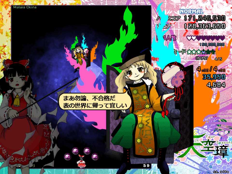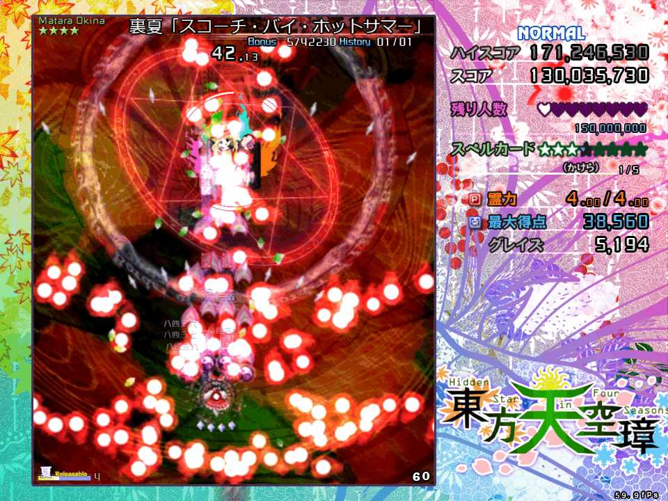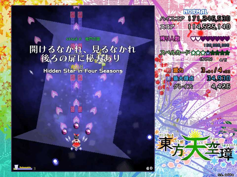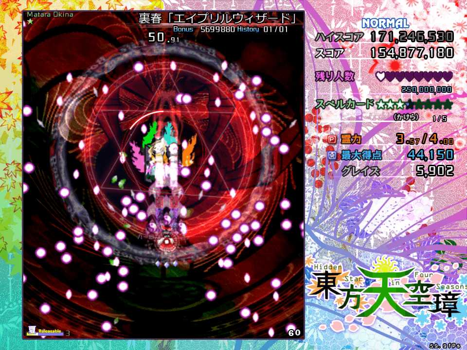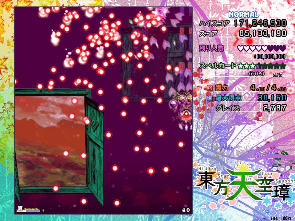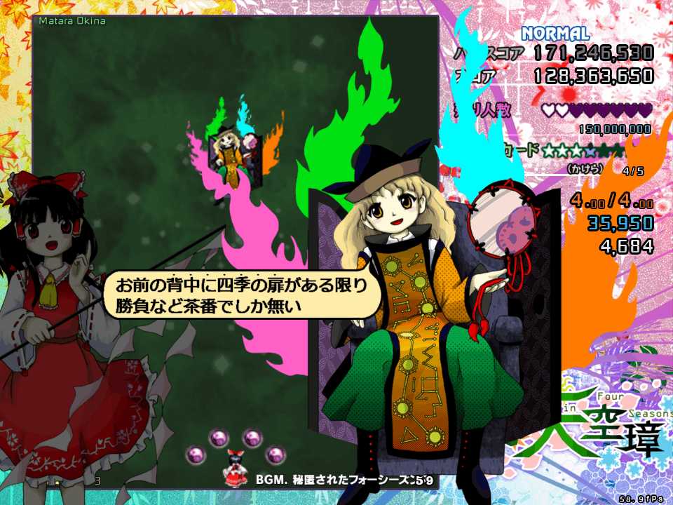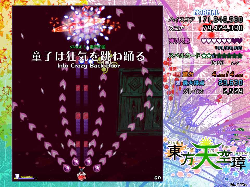 そして春夏秋冬、弾幕は全く違うのにどのスペルカードも非常に難易度が高く、季節開放は封印されてるし、ボム耐性もあるのでまさにゲームクリア前の最後の難関といったところです