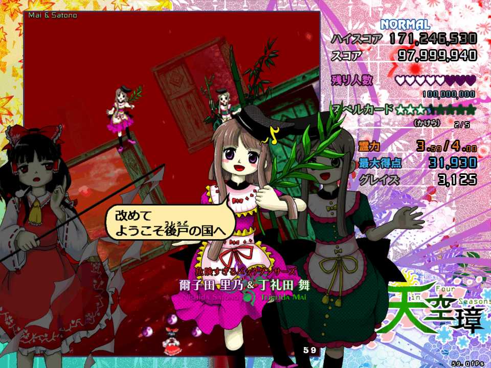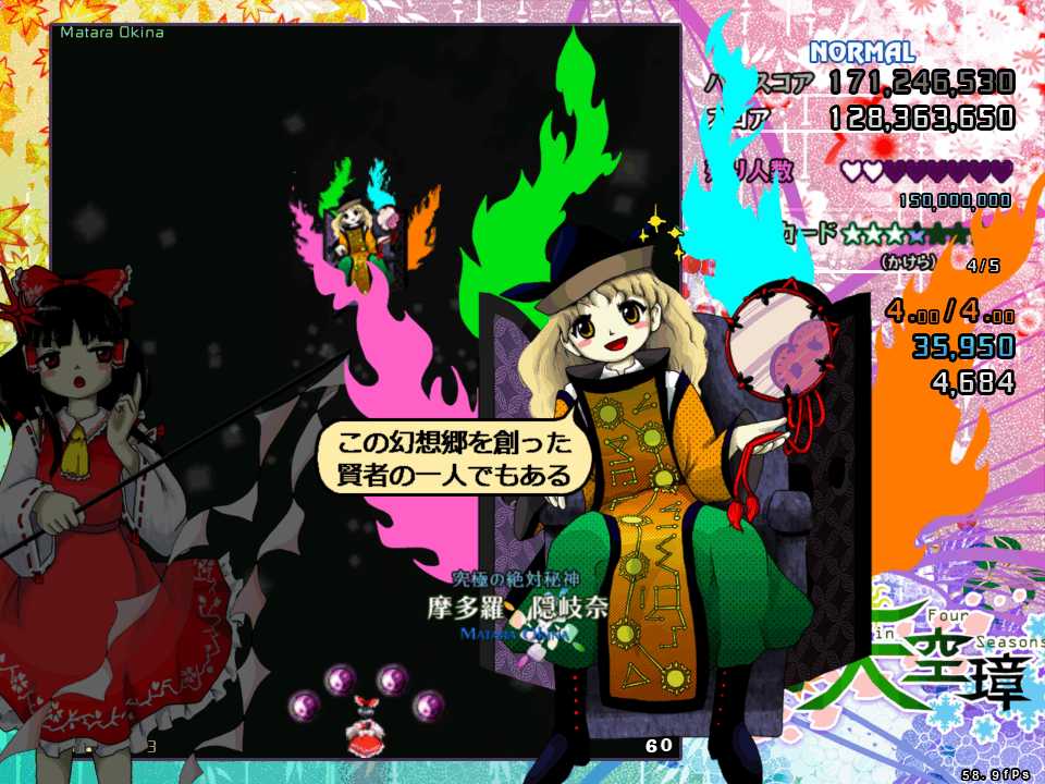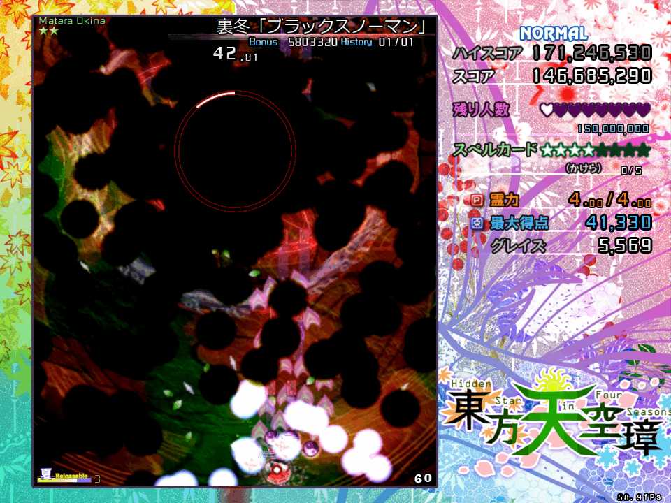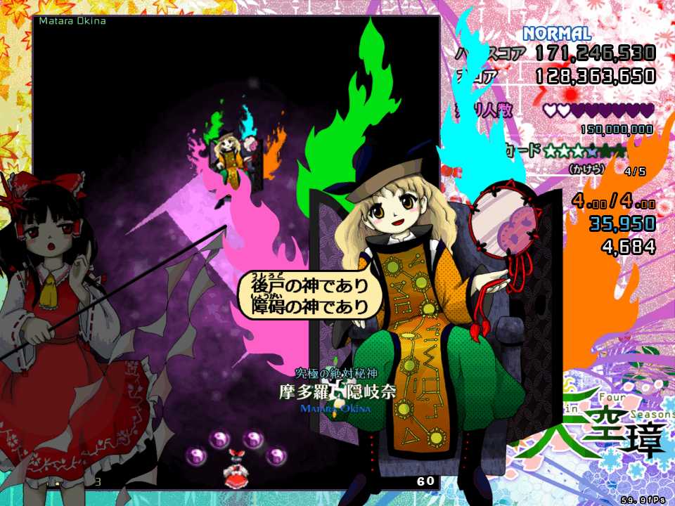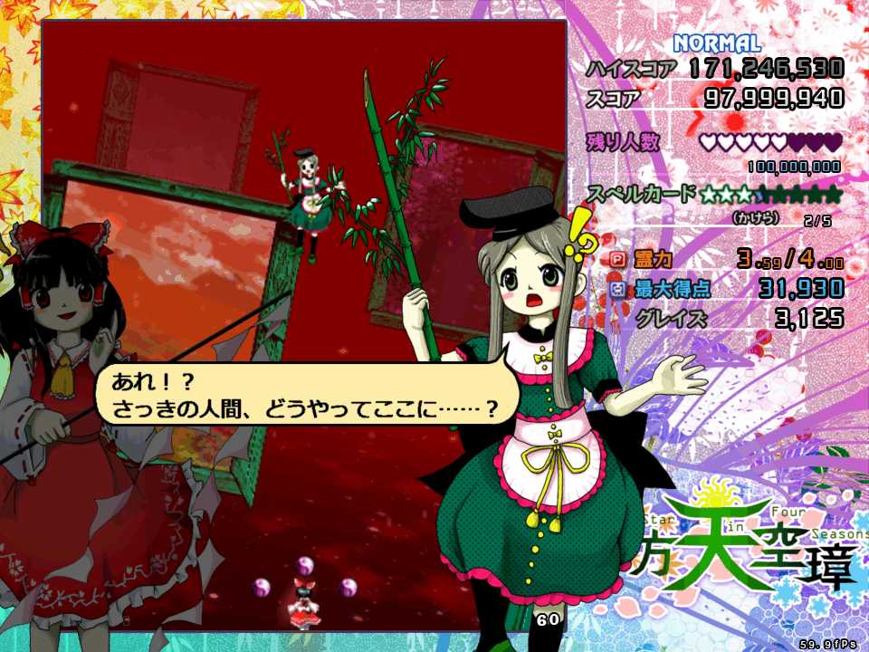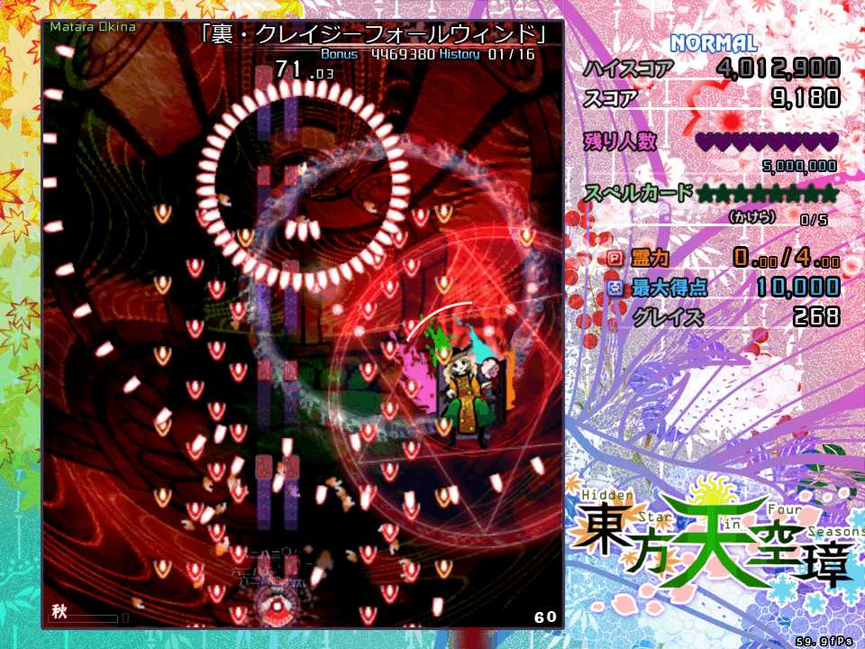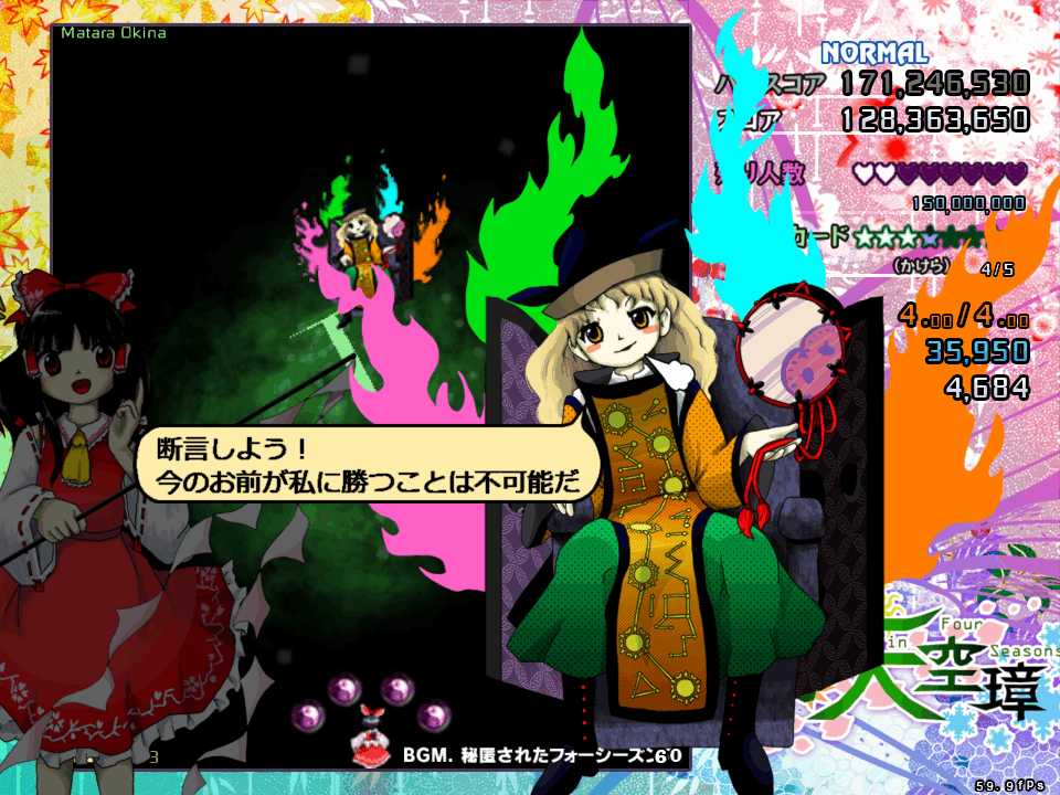 そして春夏秋冬、弾幕は全く違うのにどのスペルカードも非常に難易度が高く、季節開放は封印されてるし、ボム耐性もあるのでまさにゲームクリア前の最後の難関といったところです