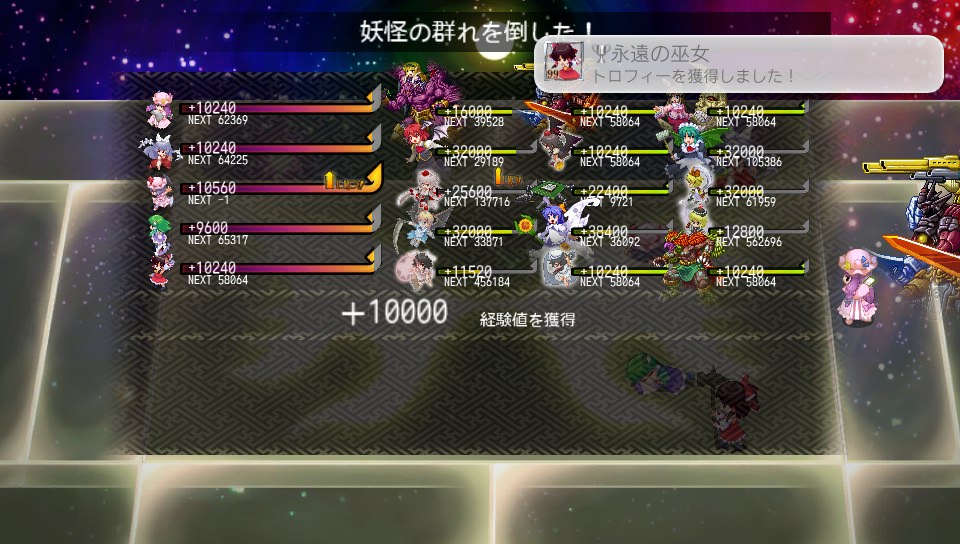 ゆっくりエンペラーを倒せなくても、装飾品やてゐのパッシブスキルで経験値ボーナスを得ればLV90台後半のキャラでも強敵1体で1~2万の経験値が得られるので、平均で30分戦えば1LV上がります