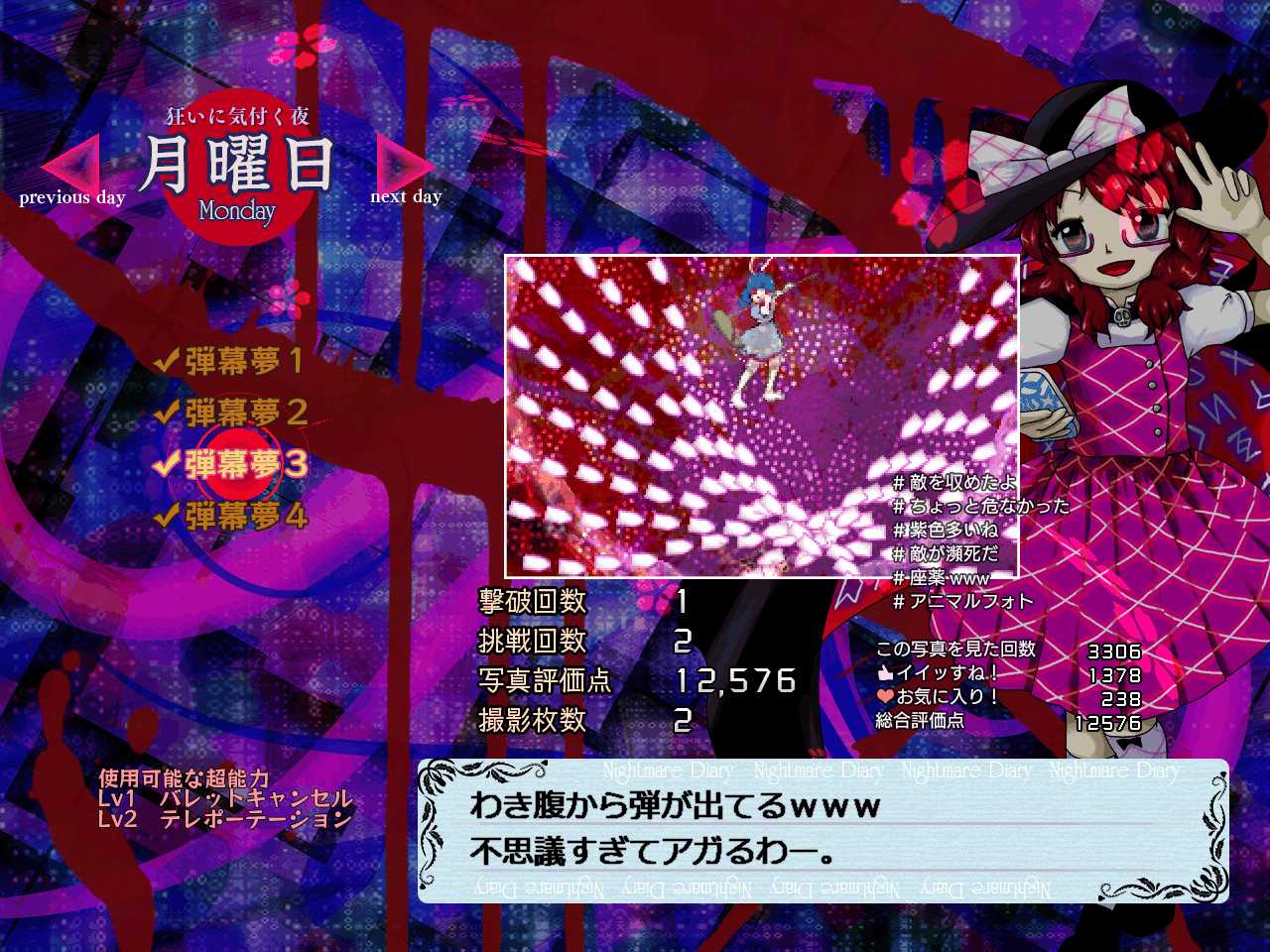 前半のシーンなら無理に使いこなさなくてもパターンを組んで写真で弾幕を消せば使わずに済むシーンもありますが、今後追加される超能力はもう少し使い勝手のいいやつを期待したいところ