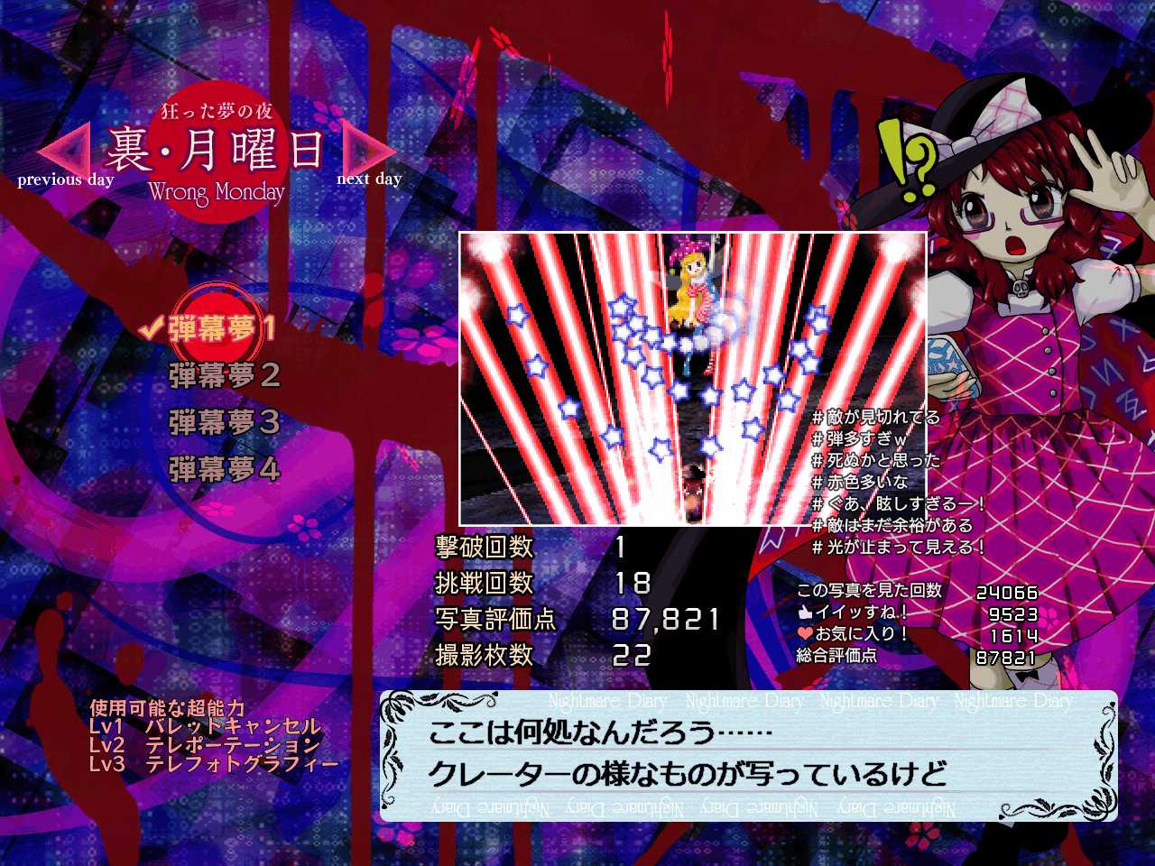 シーンによってはボスに近づかない方が良かったり、時には写真を一枚も撮らなくてもクリアできそうなこともあるんですけど、決定的瞬間を撮ってハイスコアを得るためにあえてボスに接近したり弾密度が濃いところに突っ込んで、それでミス回数が重なること、あると思います