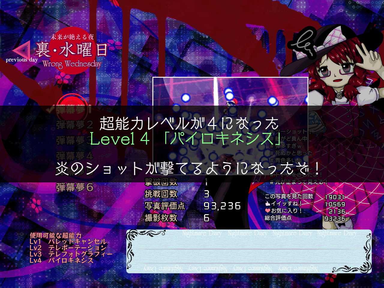 LV4の超能力、パイロキネシスを修得するとメインショットのほかにサブで火炎弾を撃てるようになり、ショットの範囲と火力が上昇