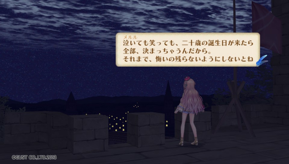 このあとアトリエでささやかなお祝い会が催された後、メルルが夜の王都でこれからのことに思いを馳せるシーンがあるのですが、実は3年経過でギリギリ合格した場合と、前倒しで目標達成した場合とではセリフが異なっていることが分かりました