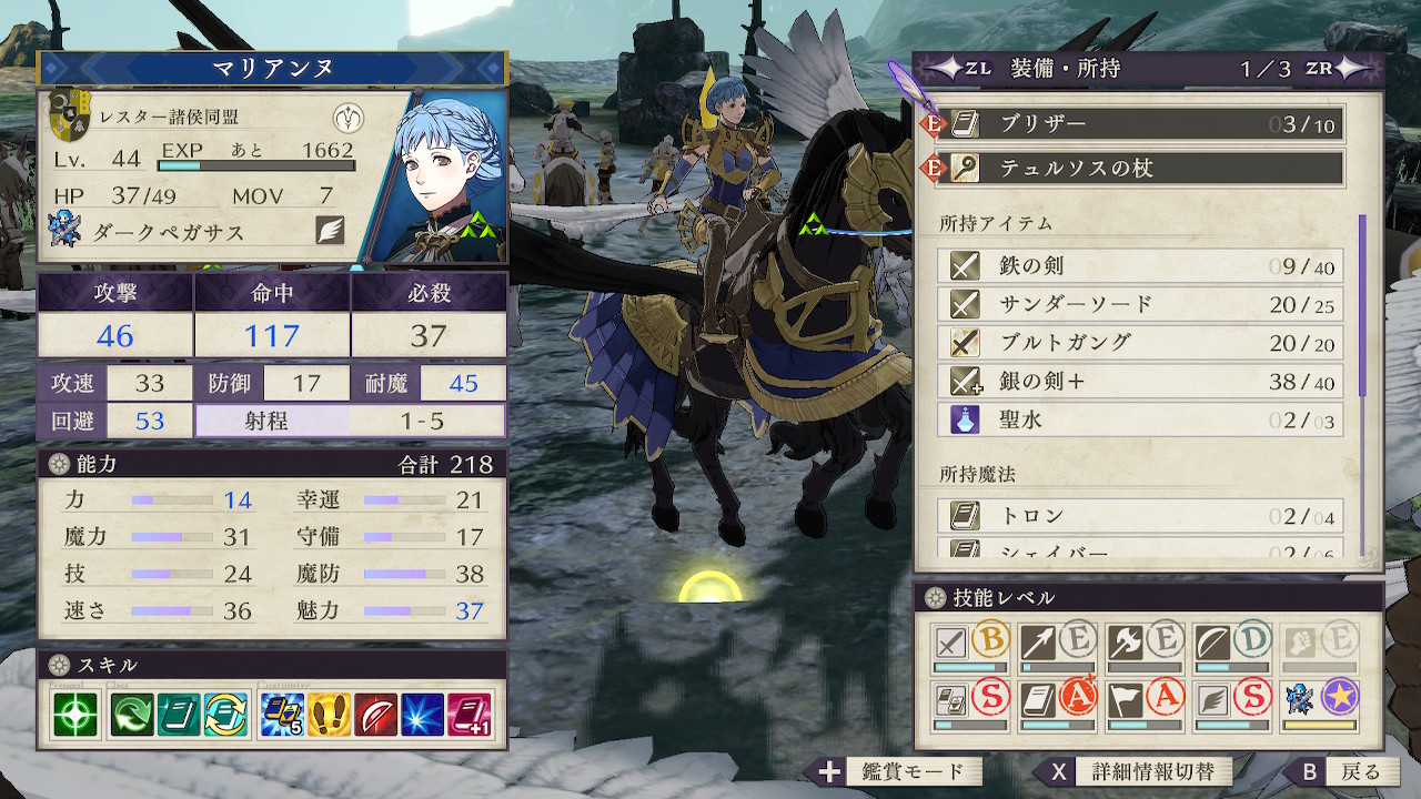 マリアンヌはダークペガサスの兵種補正の関係で魔力の伸びは控えめだが、速さが予想以上に伸びたため見た目以上に追撃しやすくされにくいというのが強みとなった