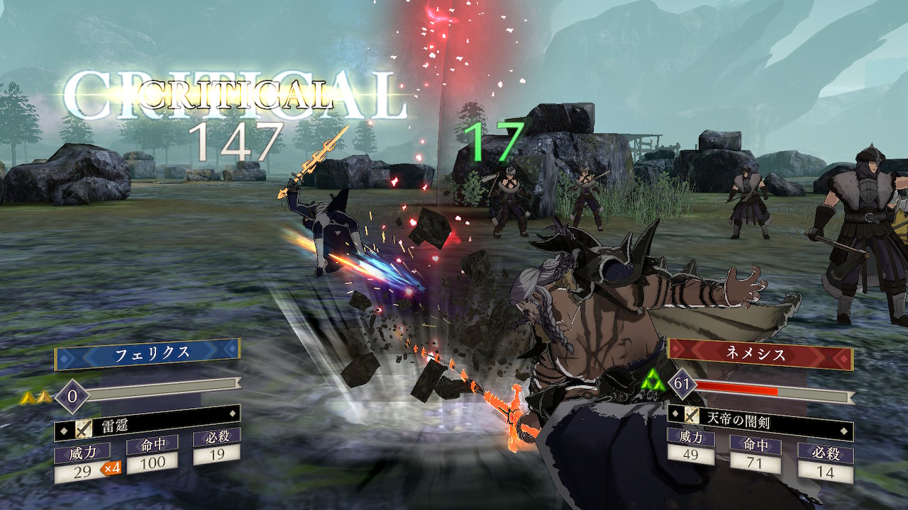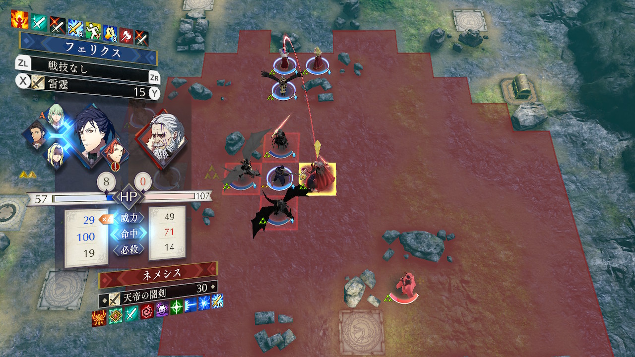 なので風薙ぎ×2回で削った後、リシテアのルナで撃破するのが定番だが、ネメシスに唯一追撃できるフェリクスの攻撃予測を見ると、雷霆の4回攻撃で倒しきってしまえるではないか!