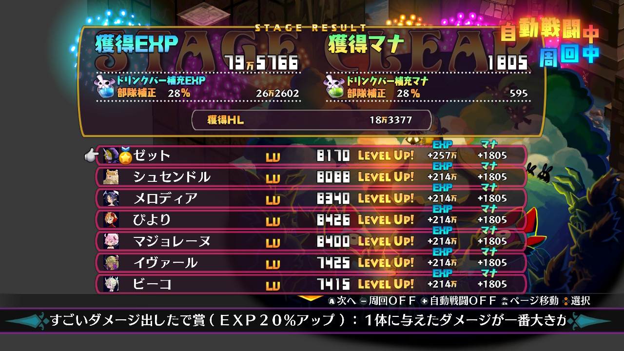 LVがカンストしても溢れた分の経験値はドリンクバーにストックされるため無駄にならないというのも今作の素晴らしいところで、これなら半数をLVカンストしてる主力にし、残りの半数を超転生直後の育成枠にすることでLVカンストキャラを量産することもできそうです