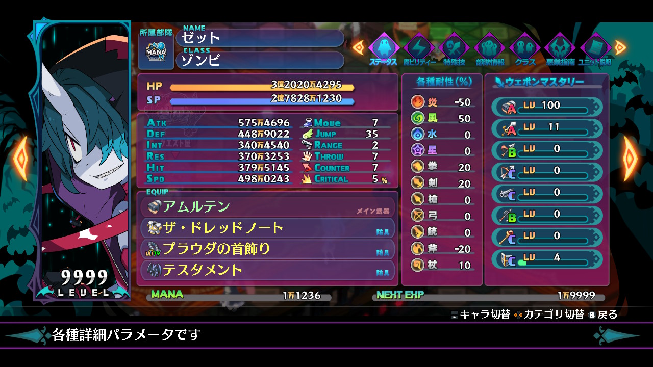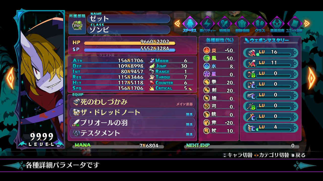このカルマ値でダメージアップや移動力強化のスキルをとった後、余ったカルマ値で基礎ステータスを伸ばしたところ、超転生前の数倍のステータスになりました