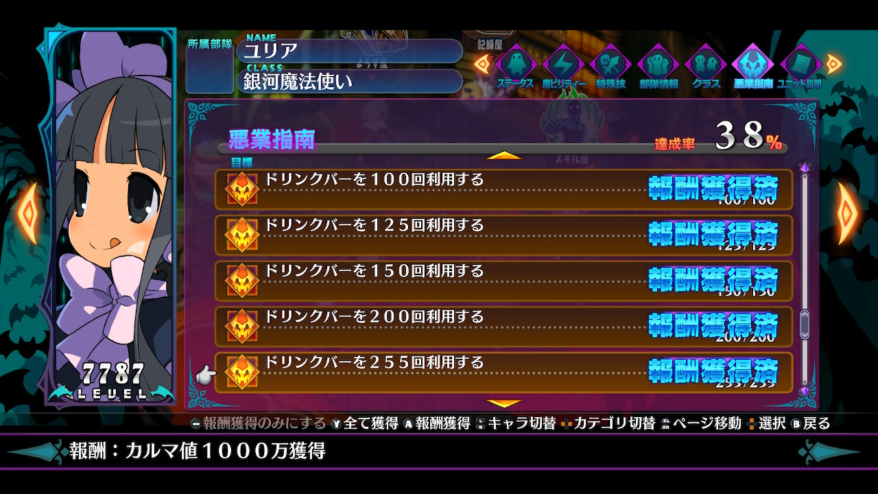 注意点としてLV7500到達の悪行指南を達成してカルマ値の上限を1000万にしておかないと達成報酬を得る際に受け取れず消失してしまう