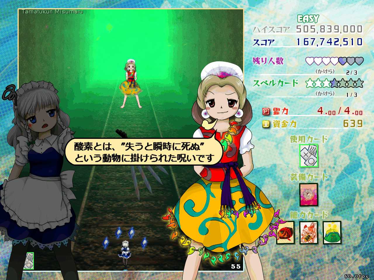 奥は無酸素エリアとなっており、人間はもちろん生物が立ち入ることのできない場所になっているのですが、咲夜操作時の会話で「動物に掛けられた呪い」によって死ぬという幻想郷的な解釈がされているのが気に入りました