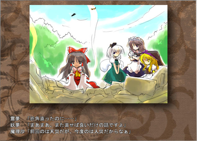 直接攻撃してくるのはほぼメルランのみ。ルナサは毎ターン全体回復してくるから、単体に対してその回復量を上回るダメージを与えればいい。リリカはたまに攻撃とか回復技使うけど防御で何もしてこないこともあるので無視。なので主力のメルラン(といっても通常攻撃しかしてこないが)を倒したら後は普通に攻撃してるだけでも勝てた。何だ、ボスなのに楽勝だった。