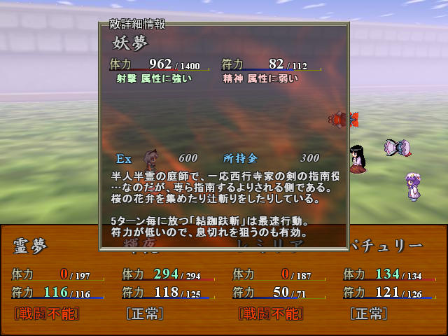 っていうかこの画像3ターン目の最初の時点なんだけど、味方のうち二人は無傷なのに残りの二人が戦闘不能になっている。いかに妖夢の単体に対しての攻撃力が高いかが見て取れる。