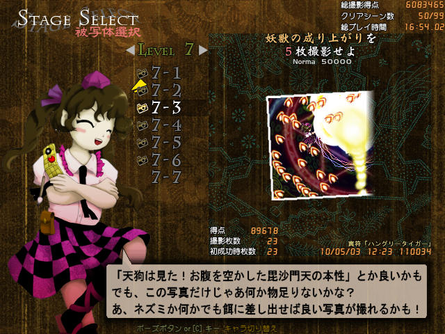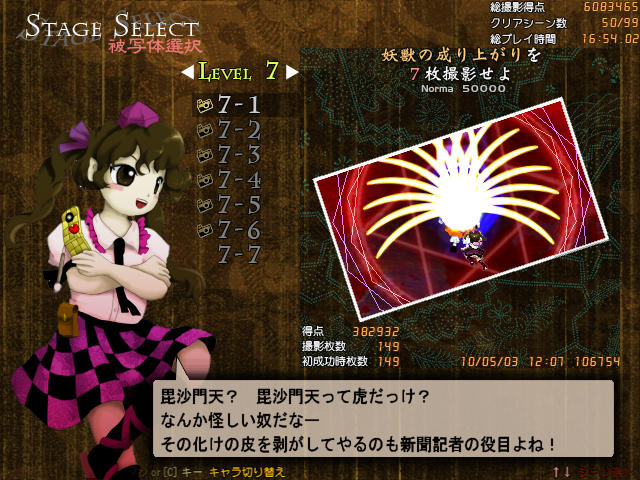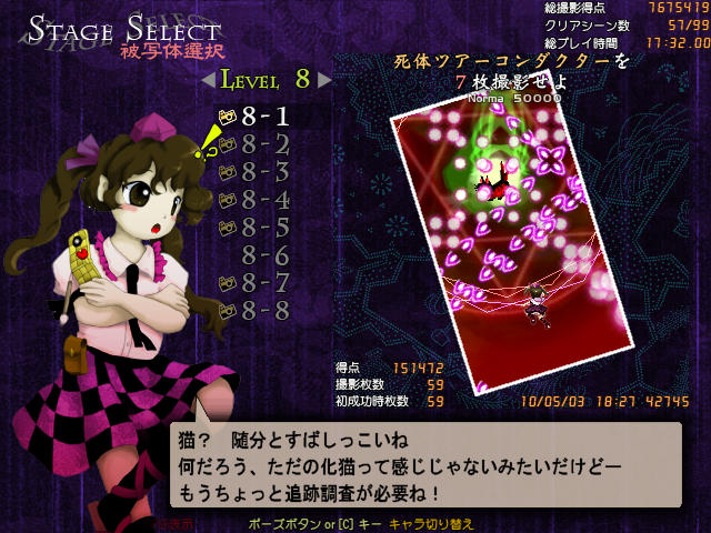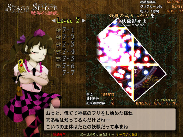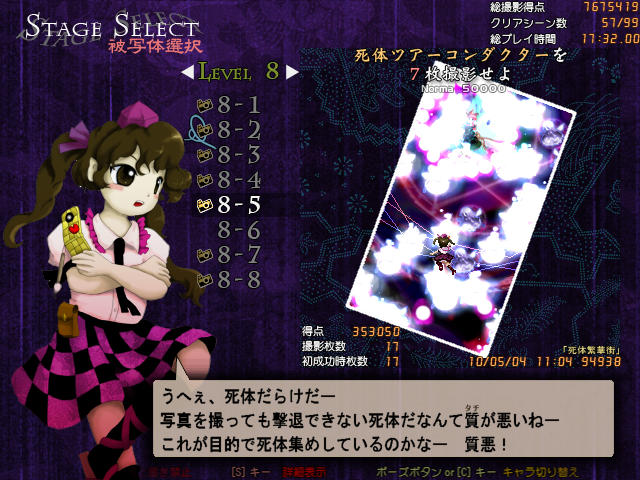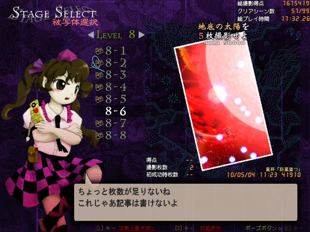 文の時はフィルムを巻くのに気をとられて避けがおろそかになりピチュるというのが良くあったが、はたては超低速移動を使わなくても次の撮影タイミングにはフィルムが溜まっているので、その間避けに集中できたことから文よりも簡単にクリアできた