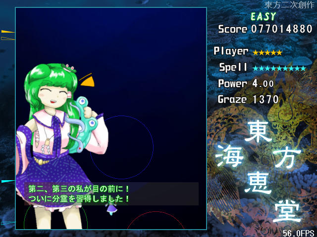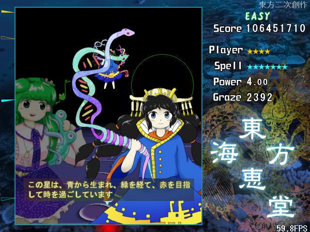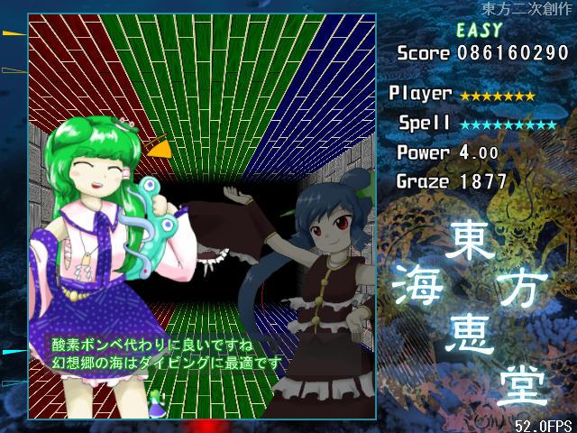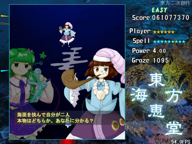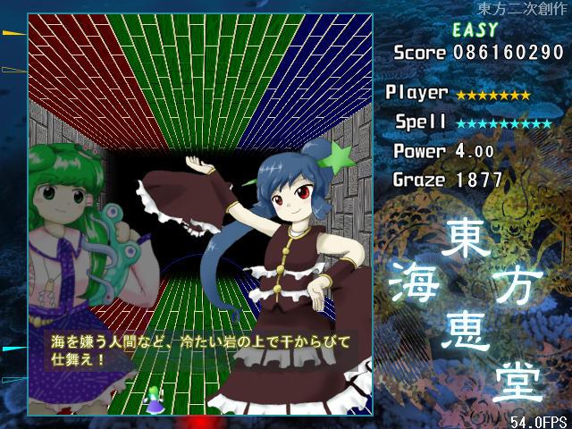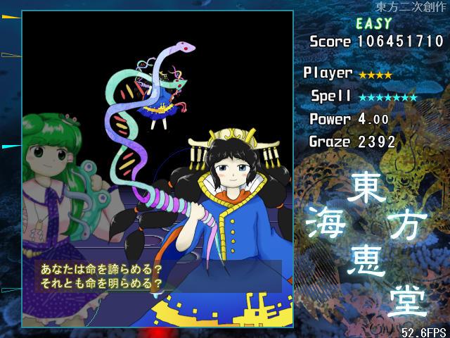 4面ボスのスペルカードが自機によって変化するのは紅魔郷以来から続く伝統(風神録と星蓮船は除く)なので、海恵堂でもそれが受け継がれているのはとても嬉しい