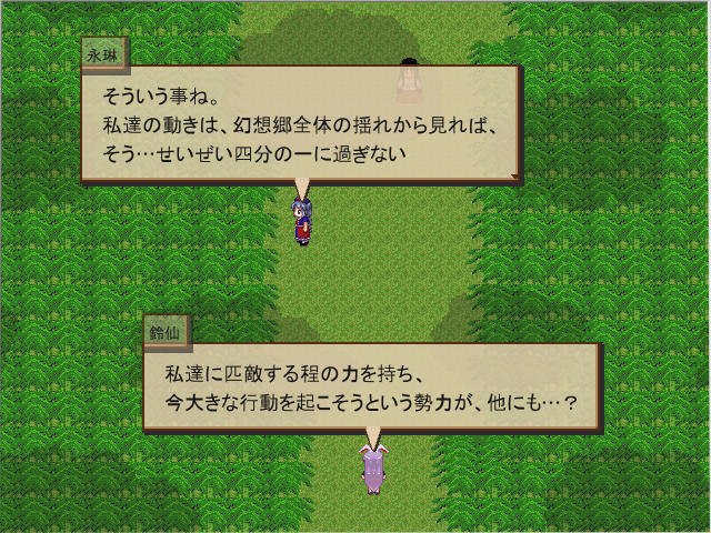 道中チルノと遭遇。スルーすることもできたけど、とりあえず倒して無理やり連れて行くことに。仲間は一人でもいたほうがいいしね。でも次のザコ戦で敵が思いのほか強かったので全滅。やっちまったと思ったらレベルや仲間はそのままに神社から再スタート。おお、全滅時のペナルティがないとは、親切設計だ。
