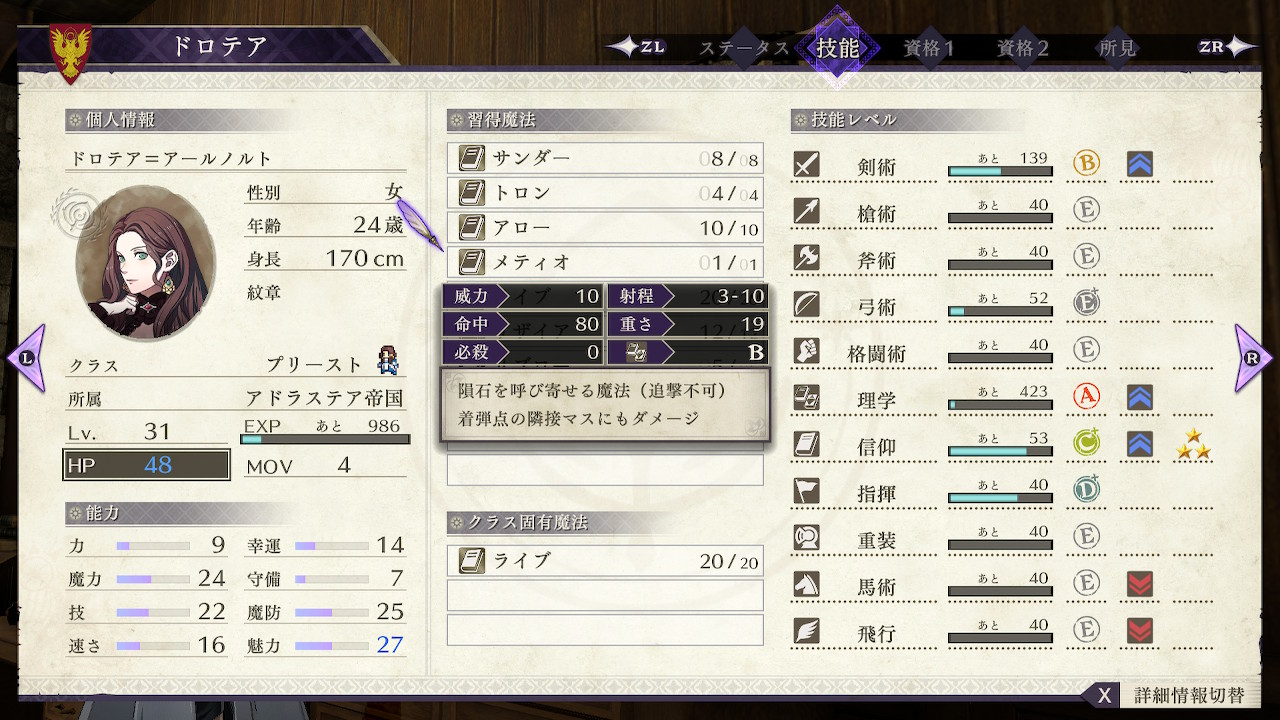 なお、ドロテアの理学がAになると遠距離魔法のメティオを修得