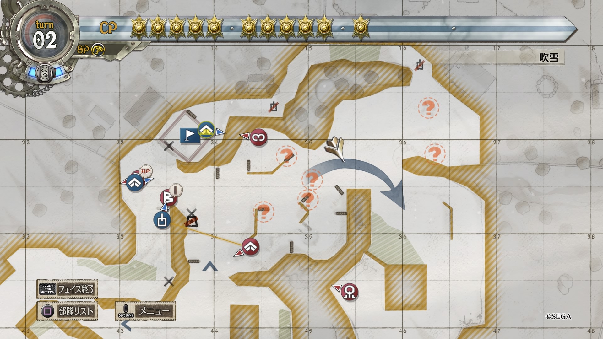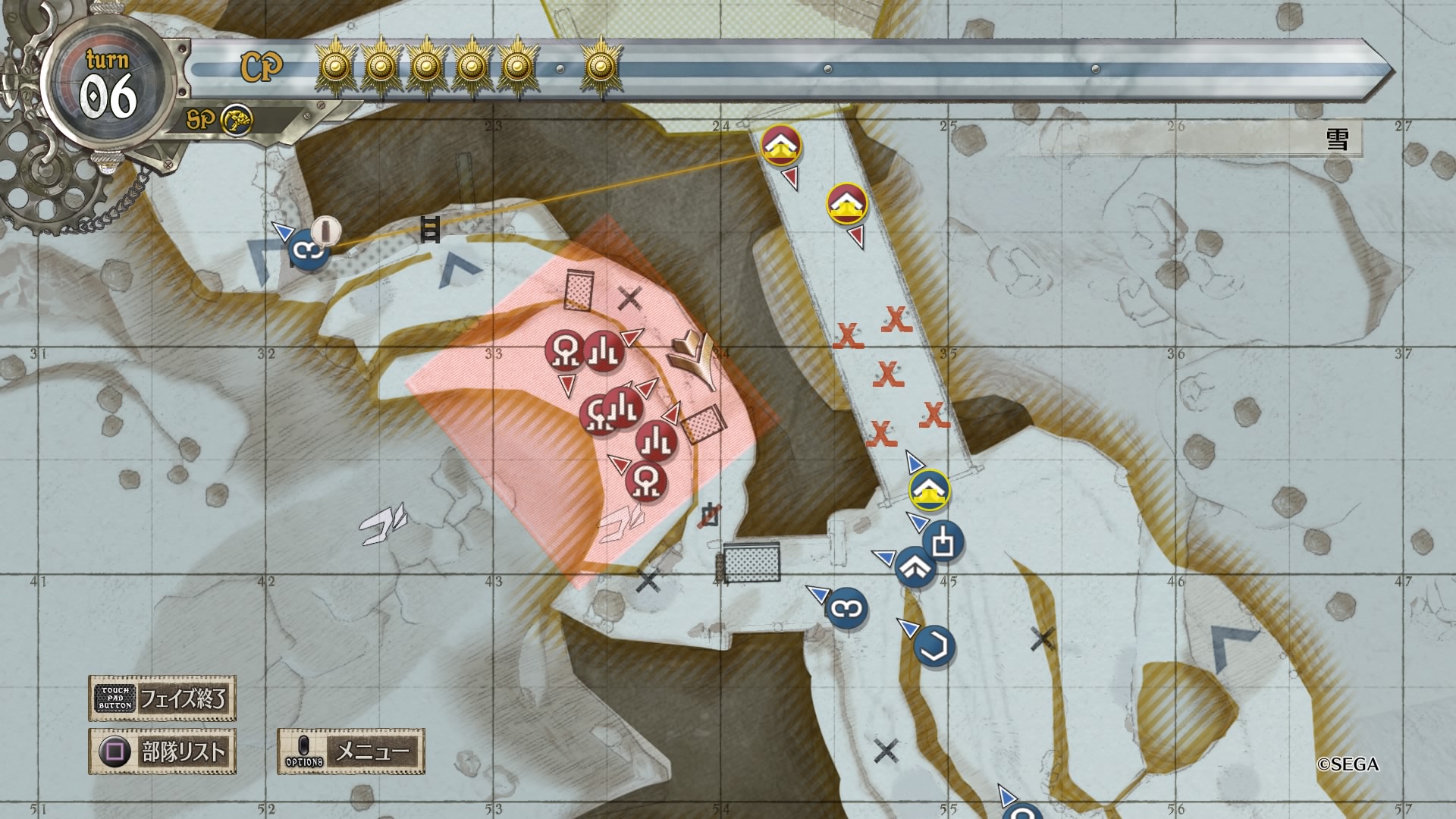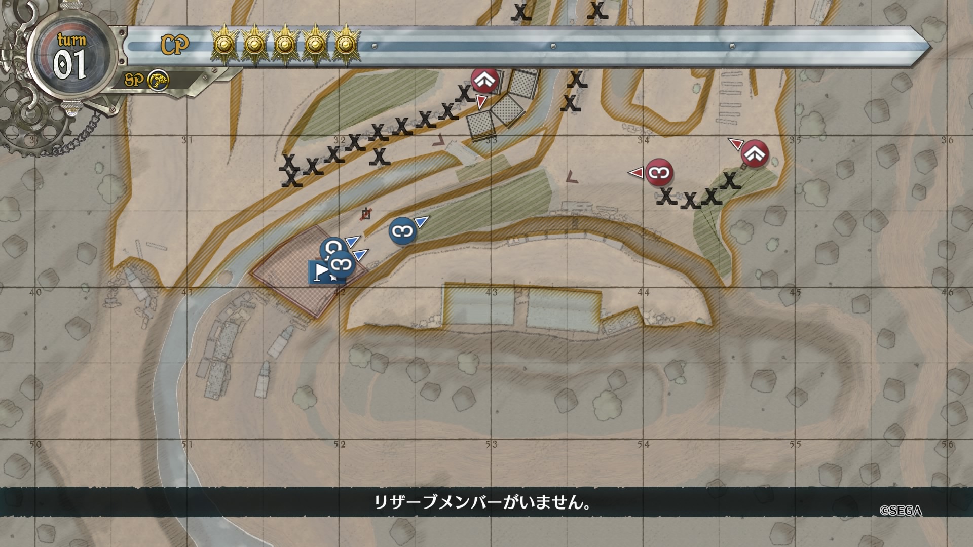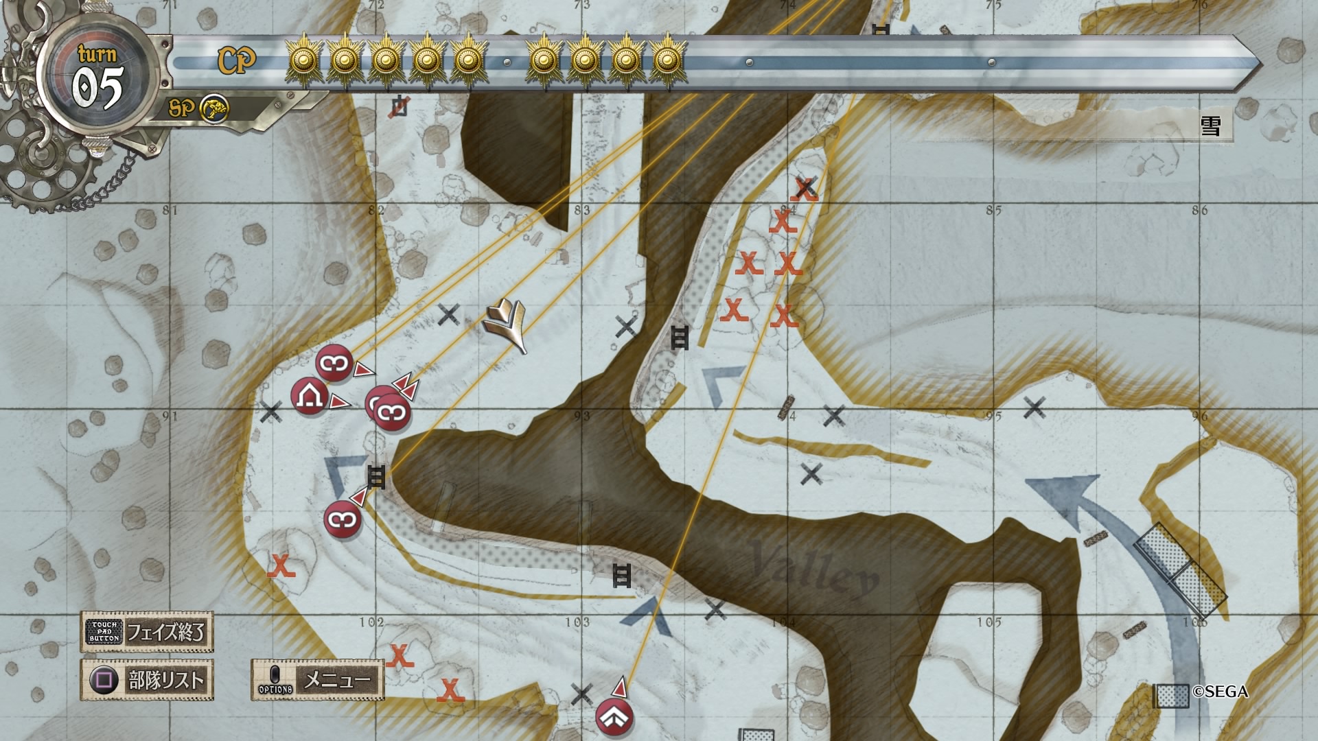 出撃枠限界までユニットを配置したいところだが、あまりユニットを配置しすぎるとCPが不足して移動できないユニットが出てしまい、背後から迫りくる敵の増援に追いつかれてしまう恐れがある