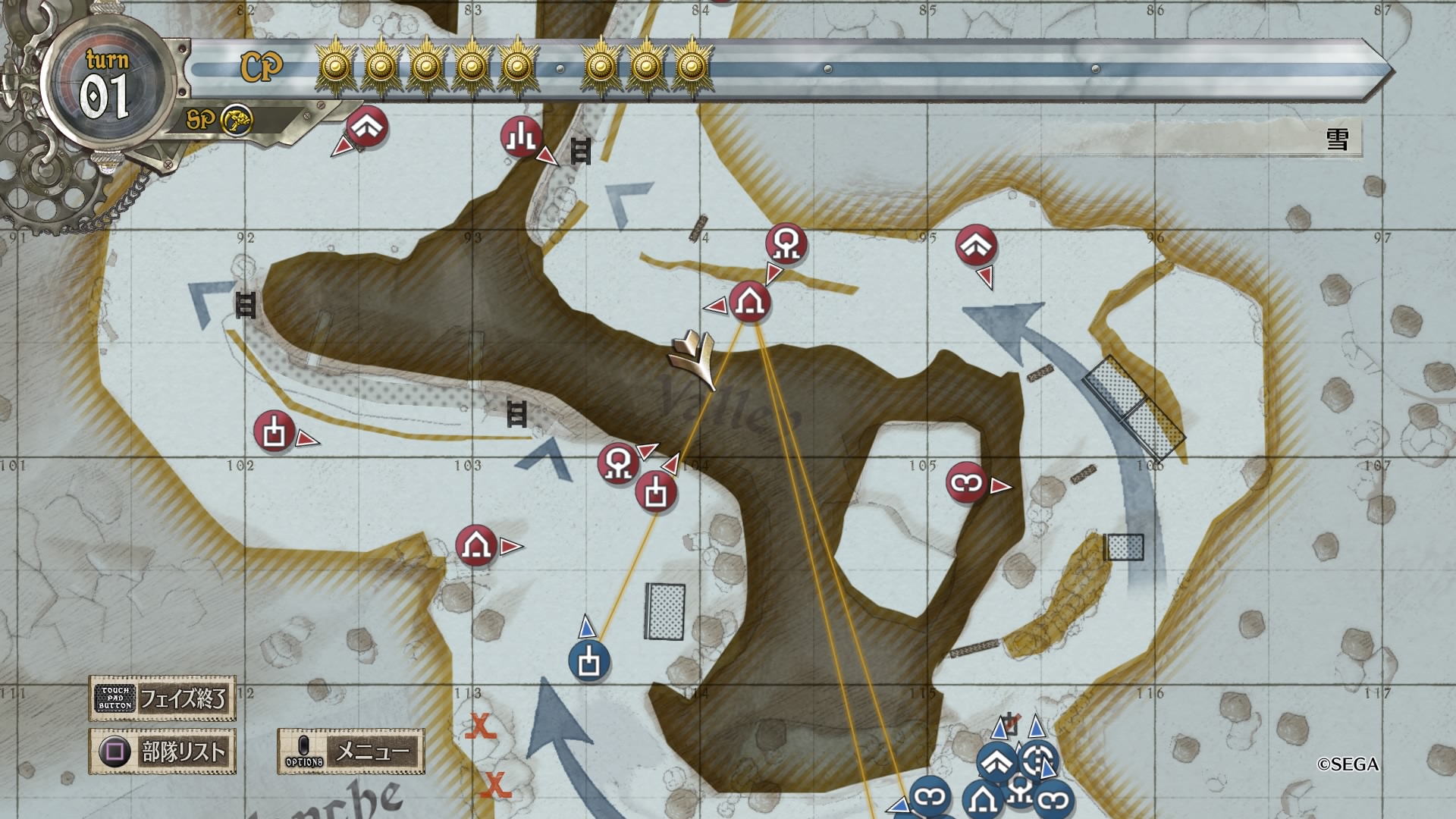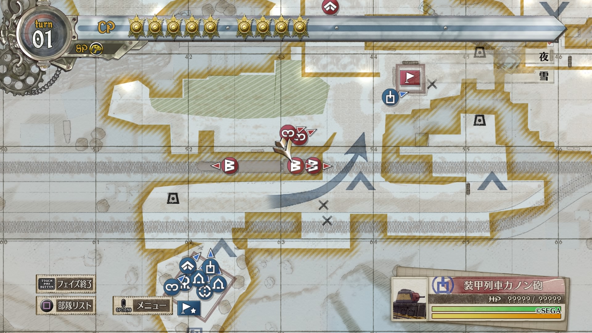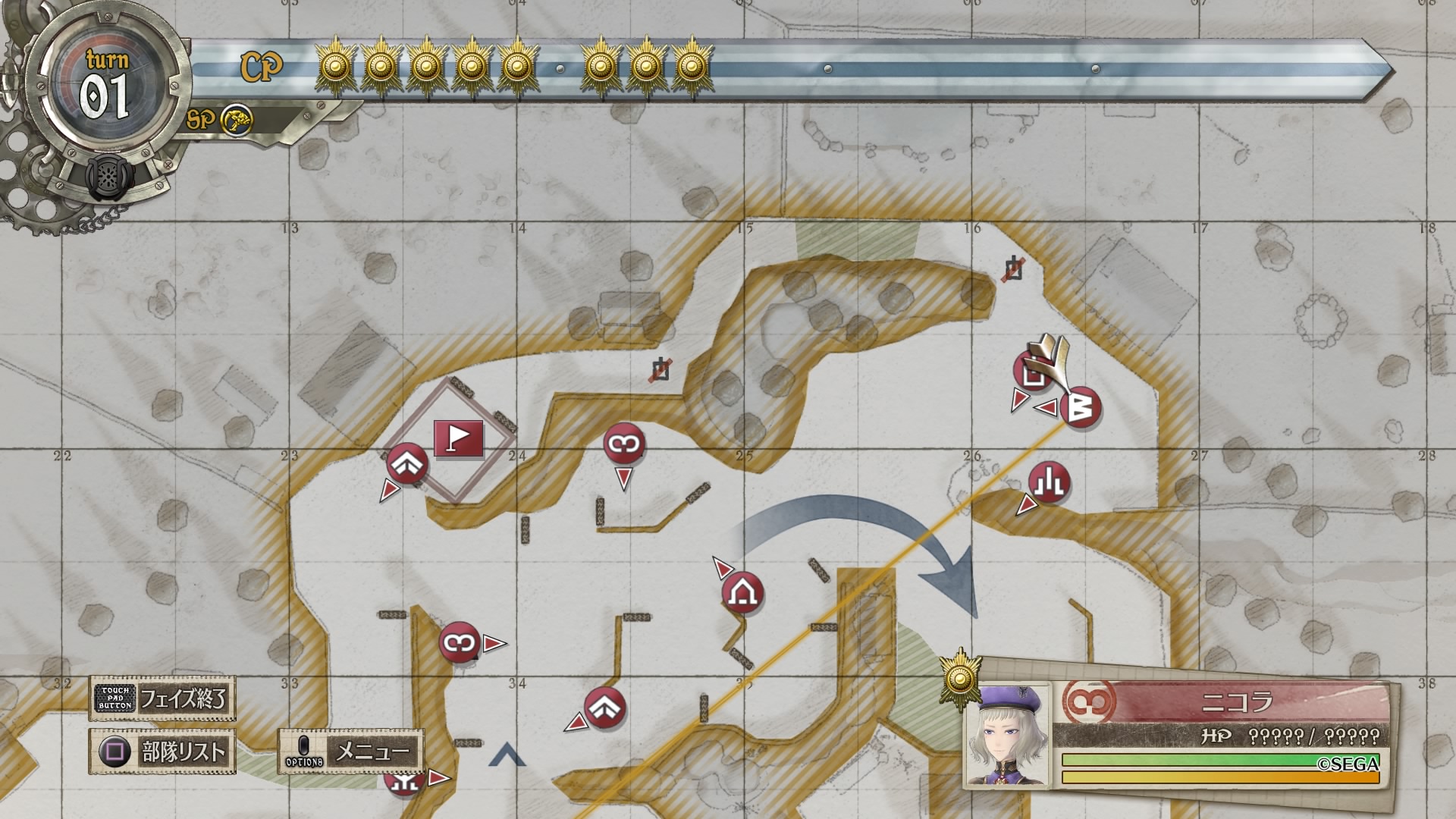 出撃枠限界までユニットを配置したいところだが、あまりユニットを配置しすぎるとCPが不足して移動できないユニットが出てしまい、背後から迫りくる敵の増援に追いつかれてしまう恐れがある