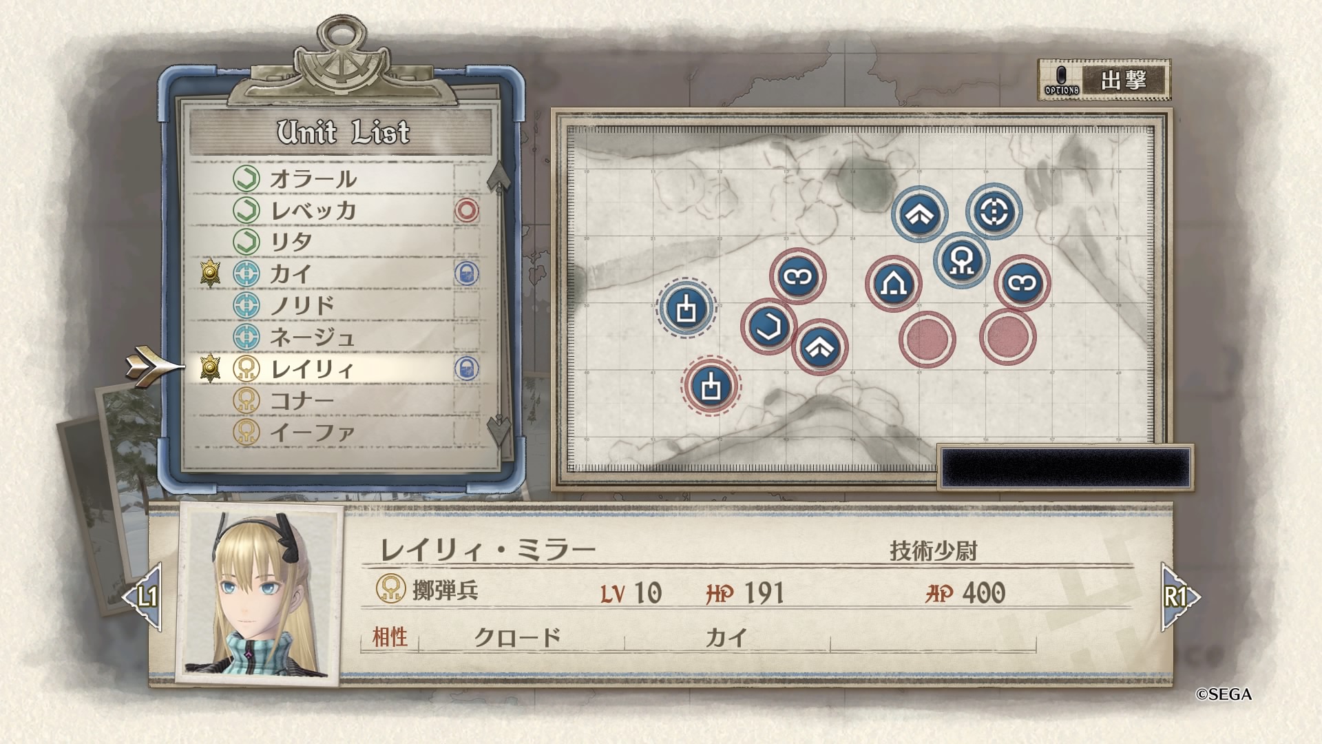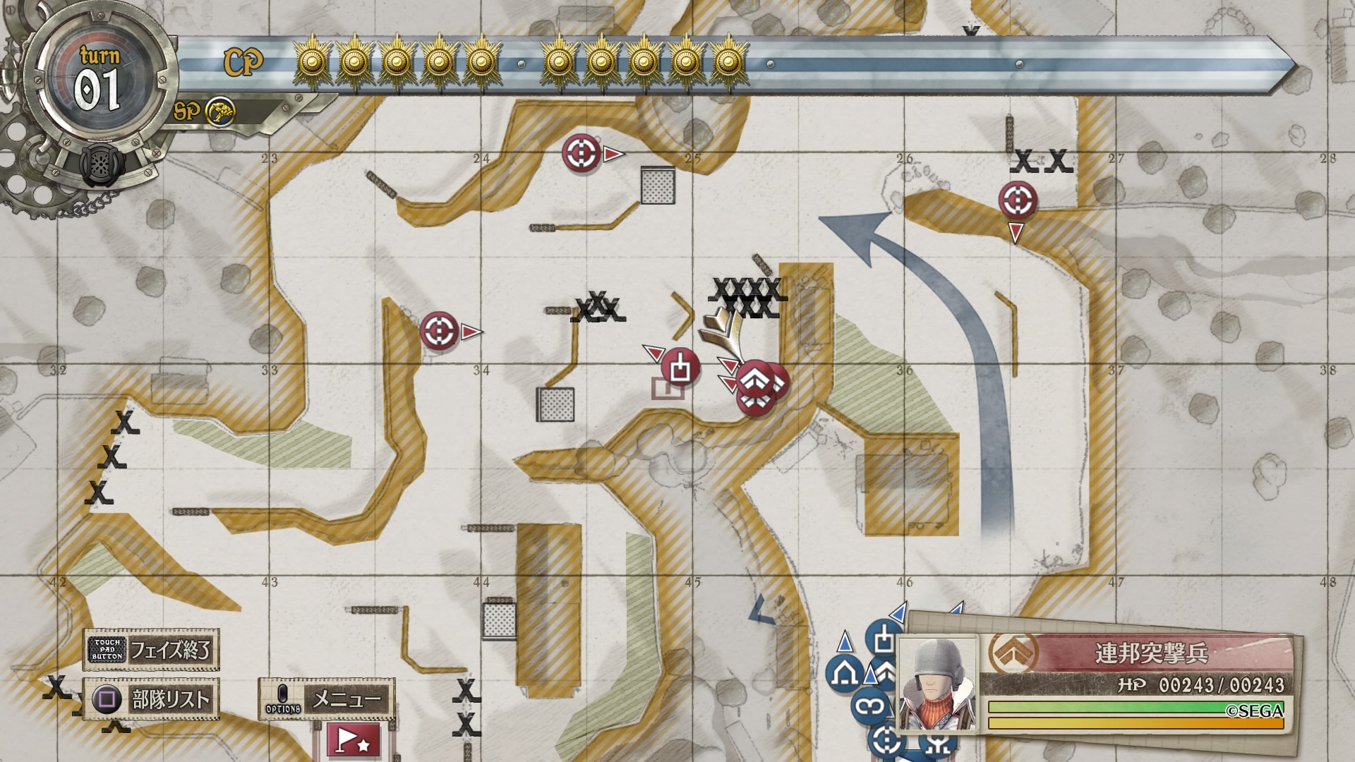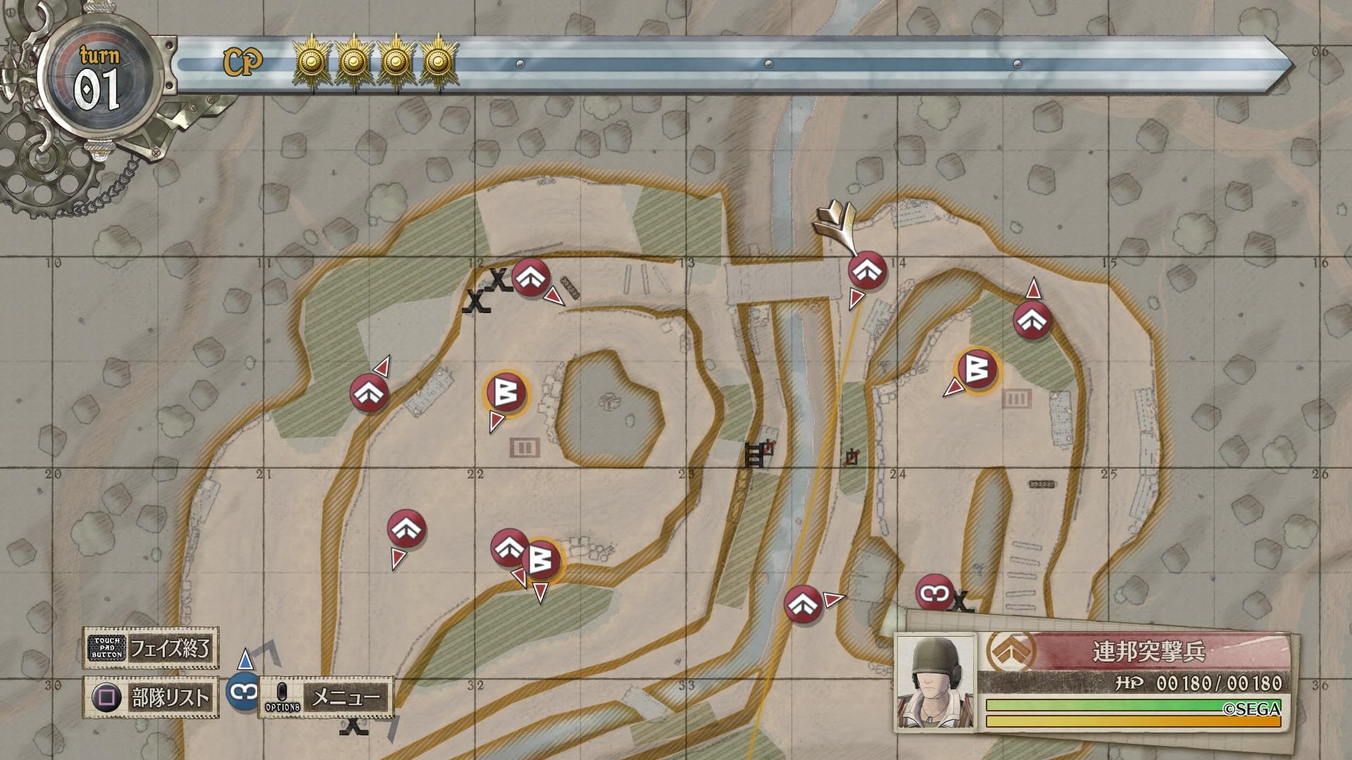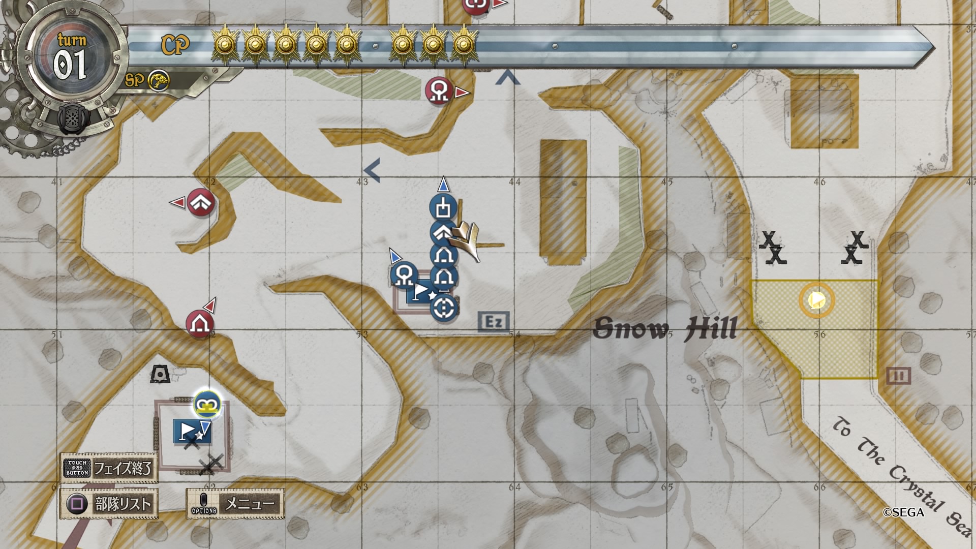 出撃枠限界までユニットを配置したいところだが、あまりユニットを配置しすぎるとCPが不足して移動できないユニットが出てしまい、背後から迫りくる敵の増援に追いつかれてしまう恐れがある
