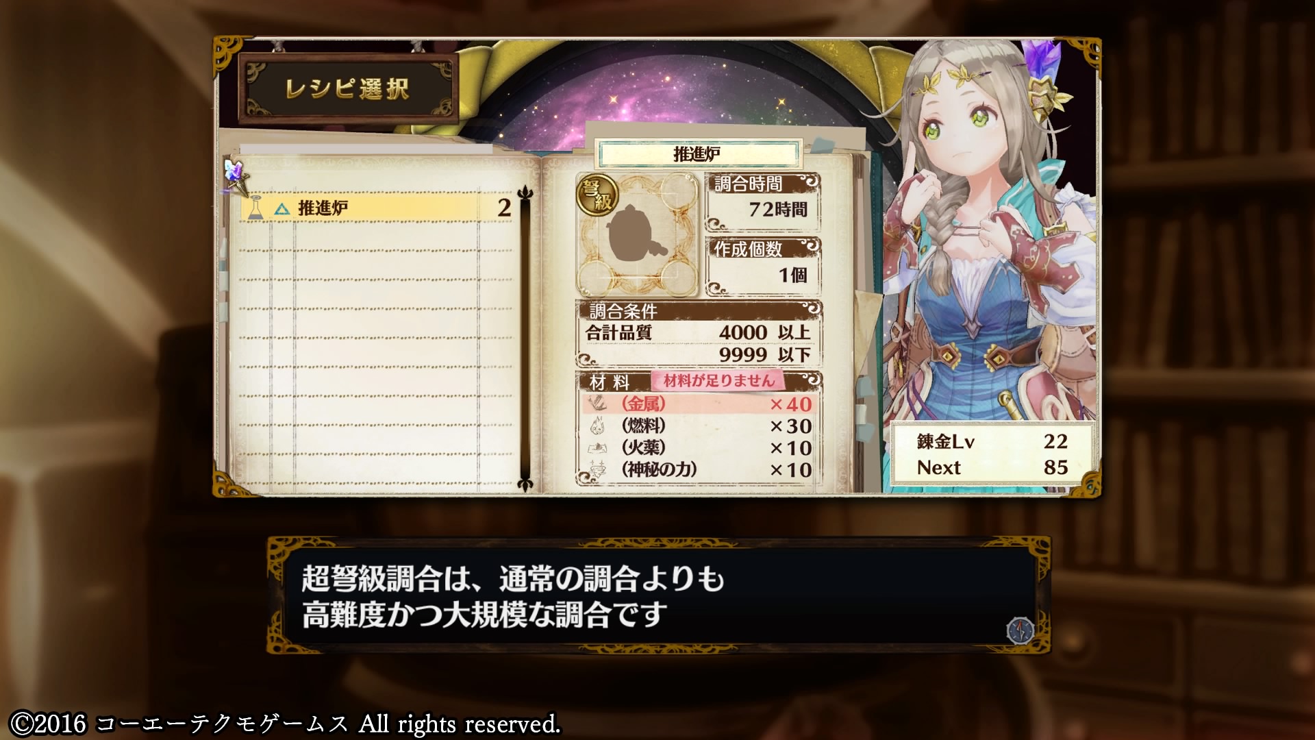ここで、釜が新しくなったことで今作の新システム、超弩級調合が解放されます