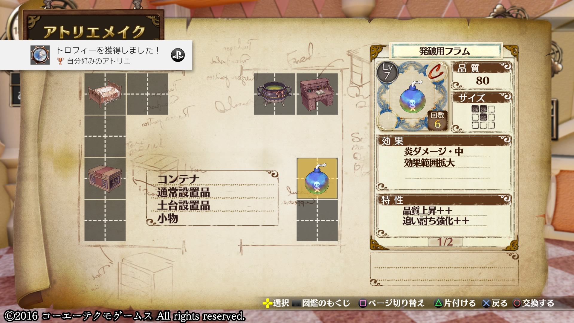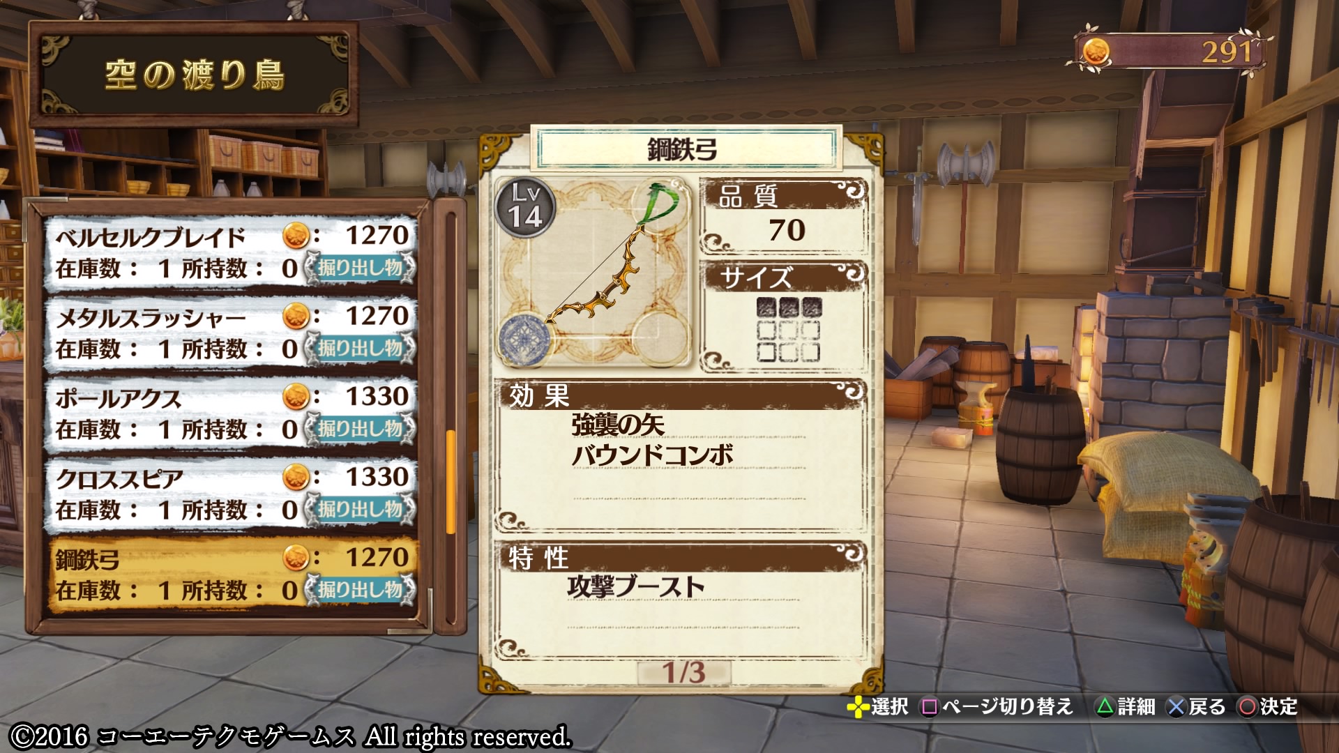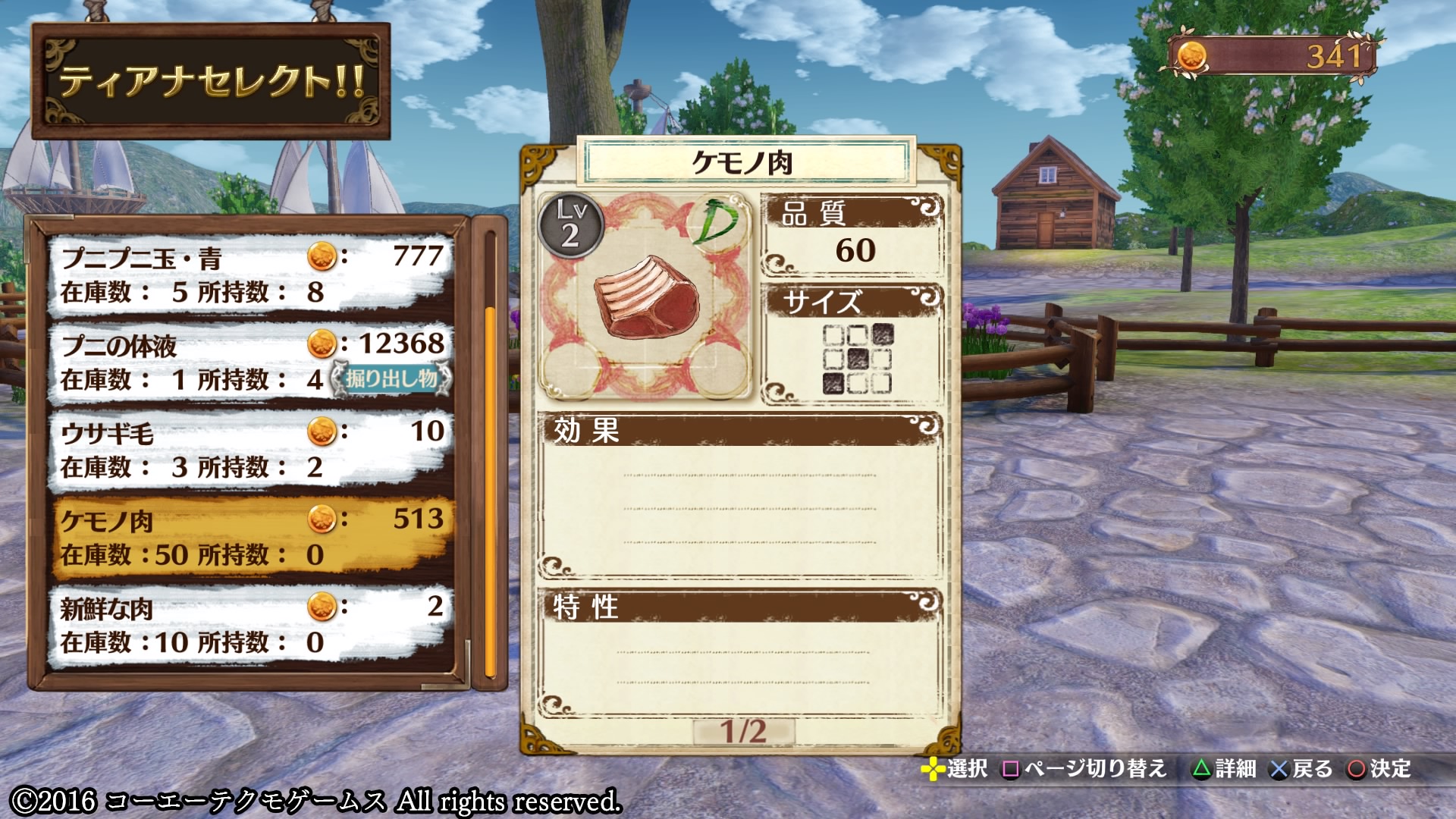 しかし、現段階では前作のコルちゃんの量販店のようにアイテムの使用回数を回復したり複製する手段がないため、使った分は自分で調合して補充しなければならないという手間があります