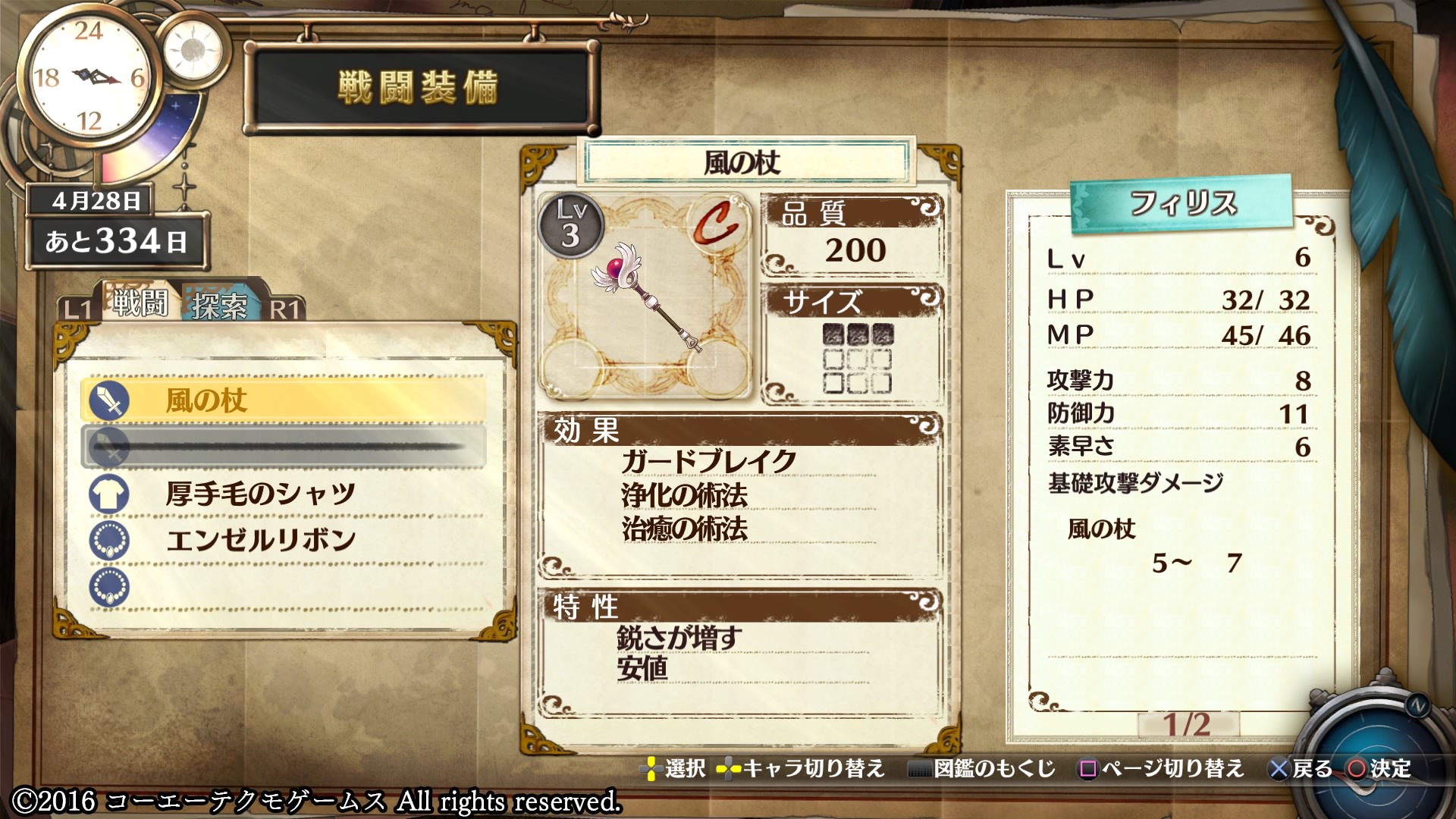 装備枠は初期から10枠あり、フィリスのLVが上がるとさらに枠が増えるので、多数のアイテムを装備、使用可能になりました
