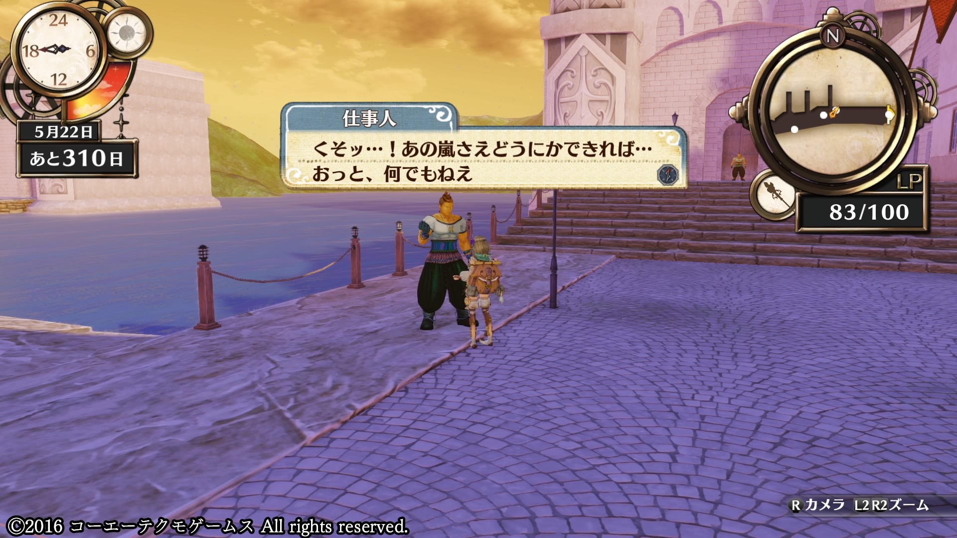 湖に出現した竜巻のせいで船が出港できなくなり、このままではライゼンベルグにたどり着けないため、なんとかして竜巻を越える方法を考えよう、というシナリオです