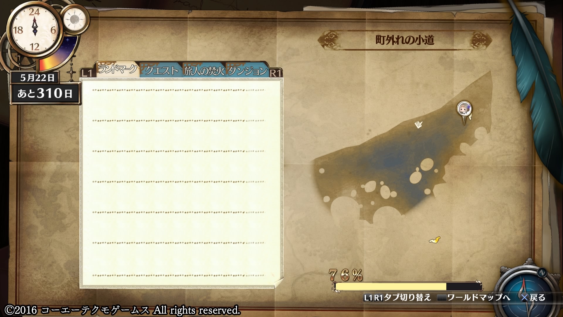 目的地がはっきりしている時は地図からショートカットで移動した方が歩いていくよりかなり時間経過が少なくて済むので、クエスト進行のためには散策しなきゃなんだけど上手く活用したいところ