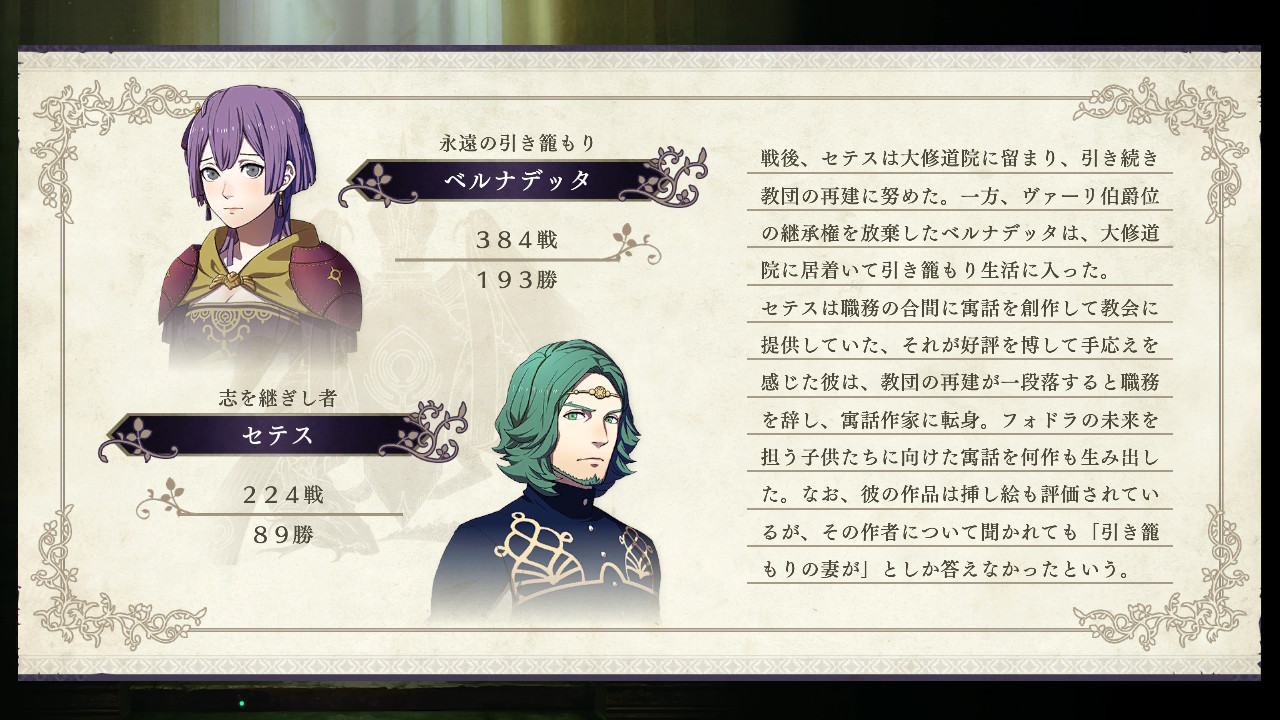 こうなったのも黒鷲の学級のエーデルガルトとヒューベルトが離脱しただけでなく、フェルディナントとペトラを育成しなかったのが大きい