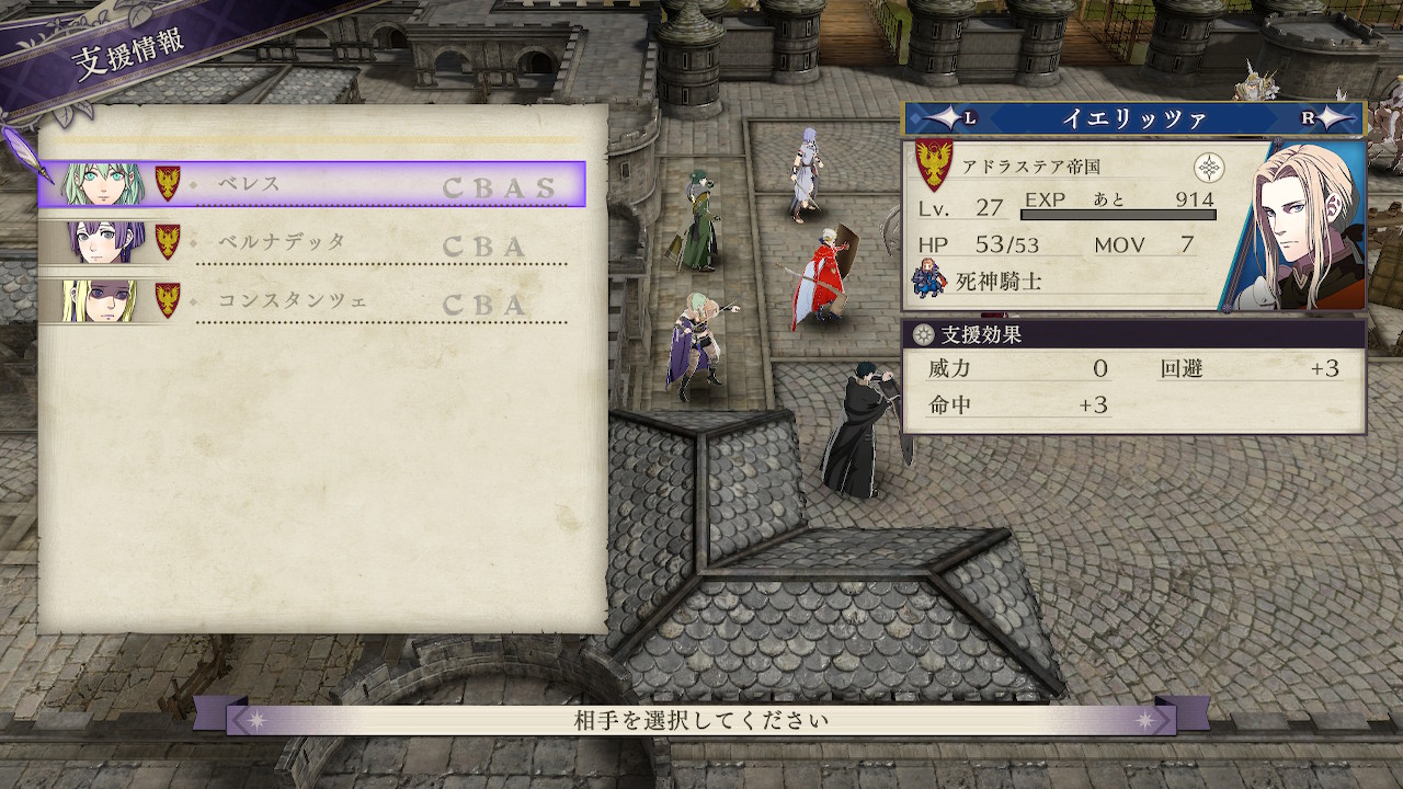 アップデートで追加されたイエリッツァは紅花の章でのみ使用可能で、前回のプレイ時は主人公とメルセデスしか支援相手がいませんでした