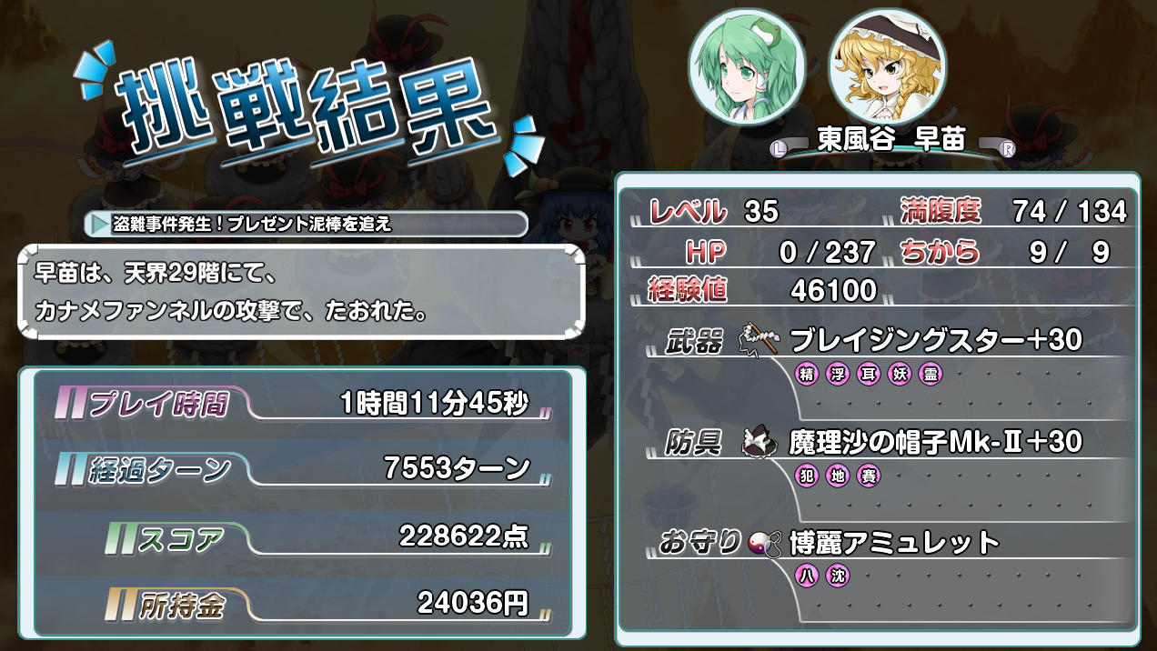 今回は限界まで強化した防具を装備していたのでカナメファンネルの攻撃のダメージは無視できるほど小さくなったのだが、それでも全人類の緋想天であれだけダメージを受けるということは、あれは防御を無視する攻撃なんだろうなあ