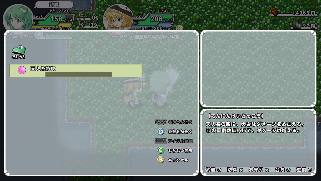 そしてアイテムを集めなおすのは面倒だったので、倉庫にある使えそうなアイテムを持ってすぐに天子のいるダンジョンへ挑戦