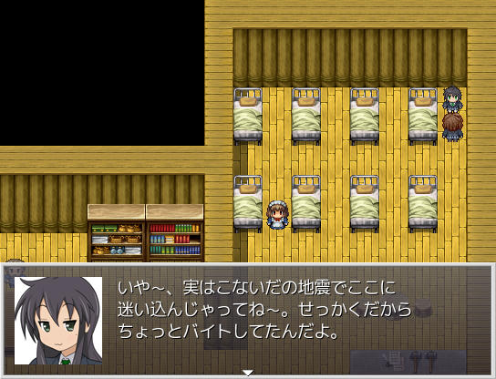 特に東方キャラ同士の会話シーンは手を抜かずに楽しい会話をさせたいんですが、サブイベントなんだからあんまり長々としゃべるのもお互いだるいかなと思い、時々会話形式ではなく相手が一方的に喋るドラクエ形式で進むイベントもあります