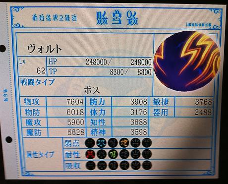 ヴォルトは火属性と風属性を持つ電撃を多用するので、クローナシンボル等で状態変化を防がないとすぐに炎上とか麻痺になります