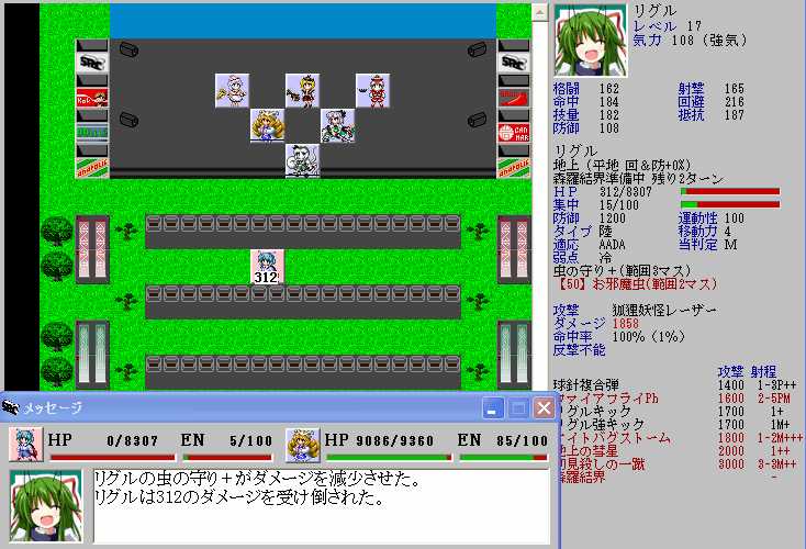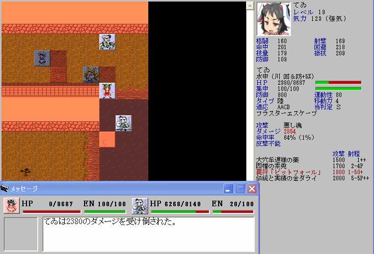 どちらも非常に攻撃力が高く、放っておくとこちらの行軍の大きな妨げとなるので、マップ右上の部隊ににとりを出撃させて、サンダーボルトで撃破しよう