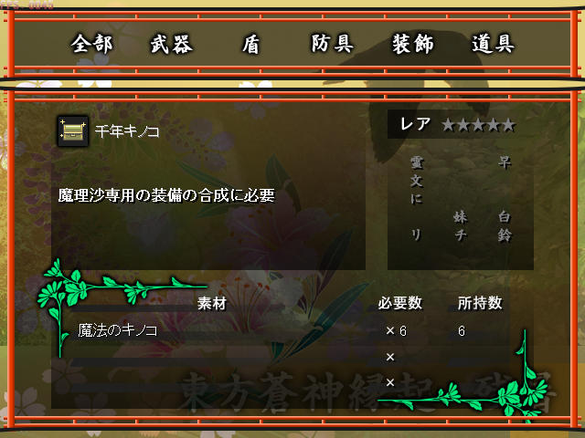 さらに、クエストを規定数クリアすると阿求からレシピがもらえるのですが、これにより香林堂で各キャラの最強素材が合成できるようになります