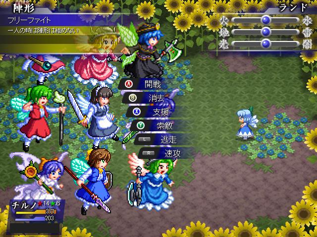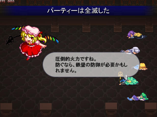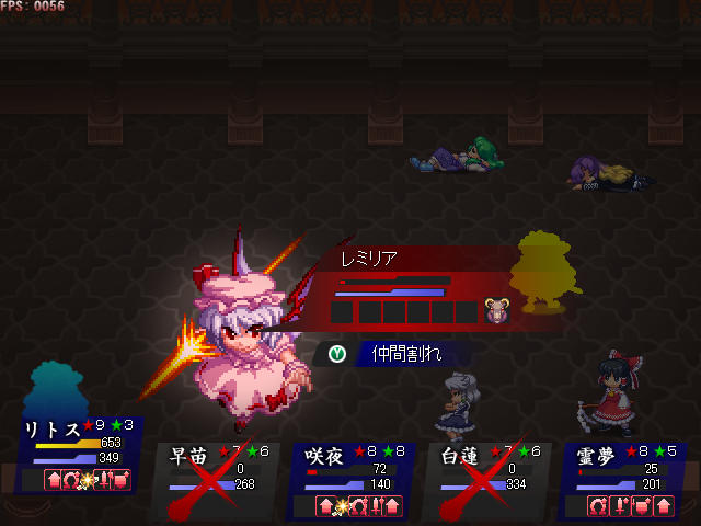 フランドールのレーヴァテインは範囲が一列の非常に強力な技なので、陣形はアリスのシールドを使ったサンシャインランチではなく、鳳凰天舞の陣が適切