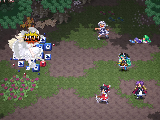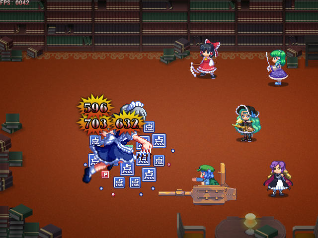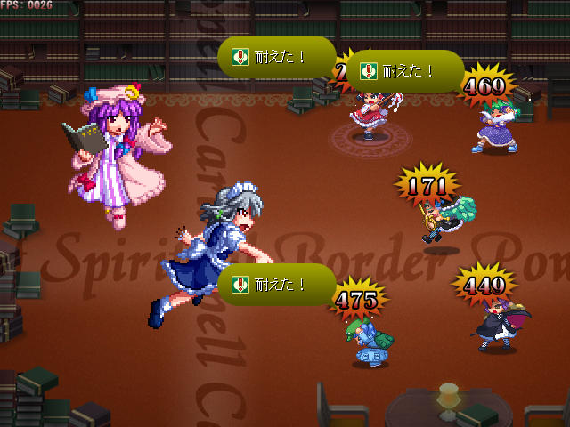 厄介なのは咲夜よりもパチュリーの方で、スペルカードの賢者の石は全体攻撃なので鳳凰天舞の陣の囮も意味をなしません