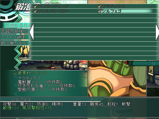 町の鍛冶屋では装備品を強化できるほかに、素材を合成して新しい装備品を作成できる