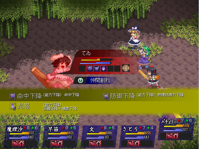 陣形をカッパカモフラージュ、早苗の補助スペルで回避率を高めるほか、さとりのスペルでてゐの命中率を減少させればほぼ全ての攻撃を回避できる