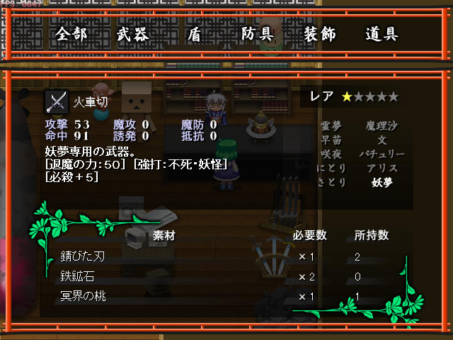 特に小町は物理攻撃が激しいので、咲夜、アリス、妖夢という重装備を装備できるキャラで防御面を固めたのも勝因の一つだったかも