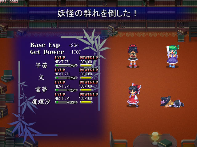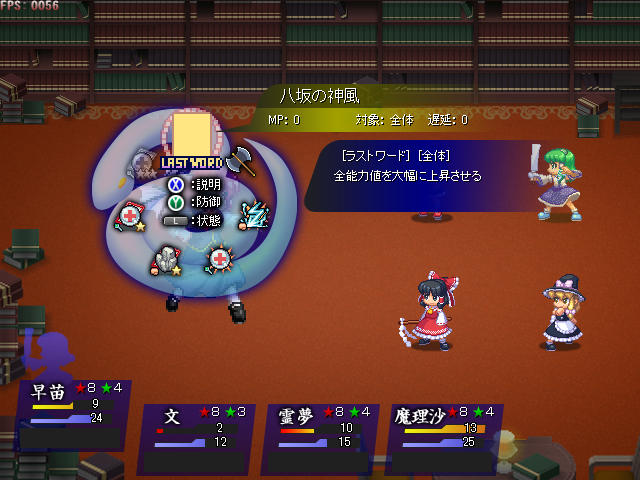 マスパを撃った後メインアタッカーの妖夢がやられたので、主力を出してから霖之助の能力でステータスを増強、メリーの攻撃に耐えつつ反撃する事で勝利できた